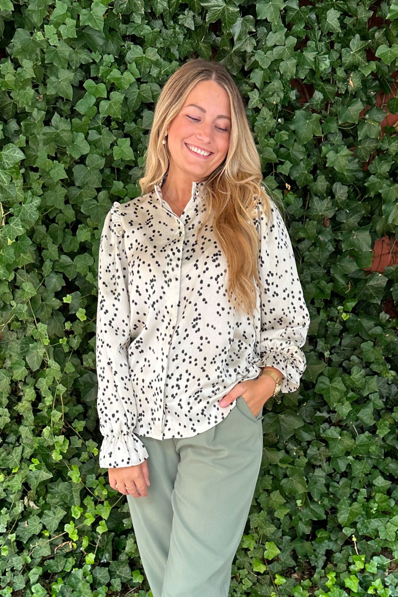 Smukkeste hvide skjorte fra Bruuns Bazaar med prikker. Den har et løstsiddende snit med lange løse ærmer som bliver afsluttet med elastikkant som giver en lille flæse. Skjorten har knapper hele vejen ned og har en høj kinakrave. Selve materialet har en flot shinekvalitet som giver en smuk og elegant effekt.