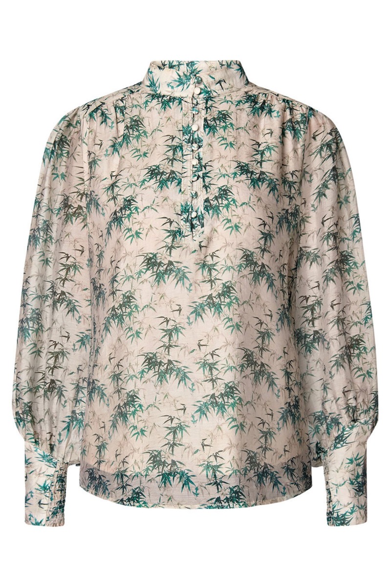 En smuk bluse fra Bruuns Bazaar er kommet i et flot grønt print. Den er foret med en fastsyet undertop så den ikke bliver gennemsigtig. Den har derudover en lille turtleneck og udadvendt knapper ned til midten. Ærmerne afsluttes med en smock effekt som kun sidder på undersiden af håndleddet. En dejlig let kvalitet.