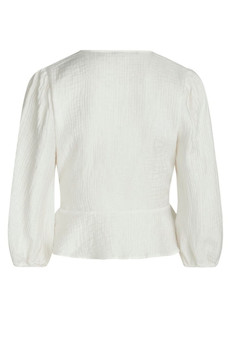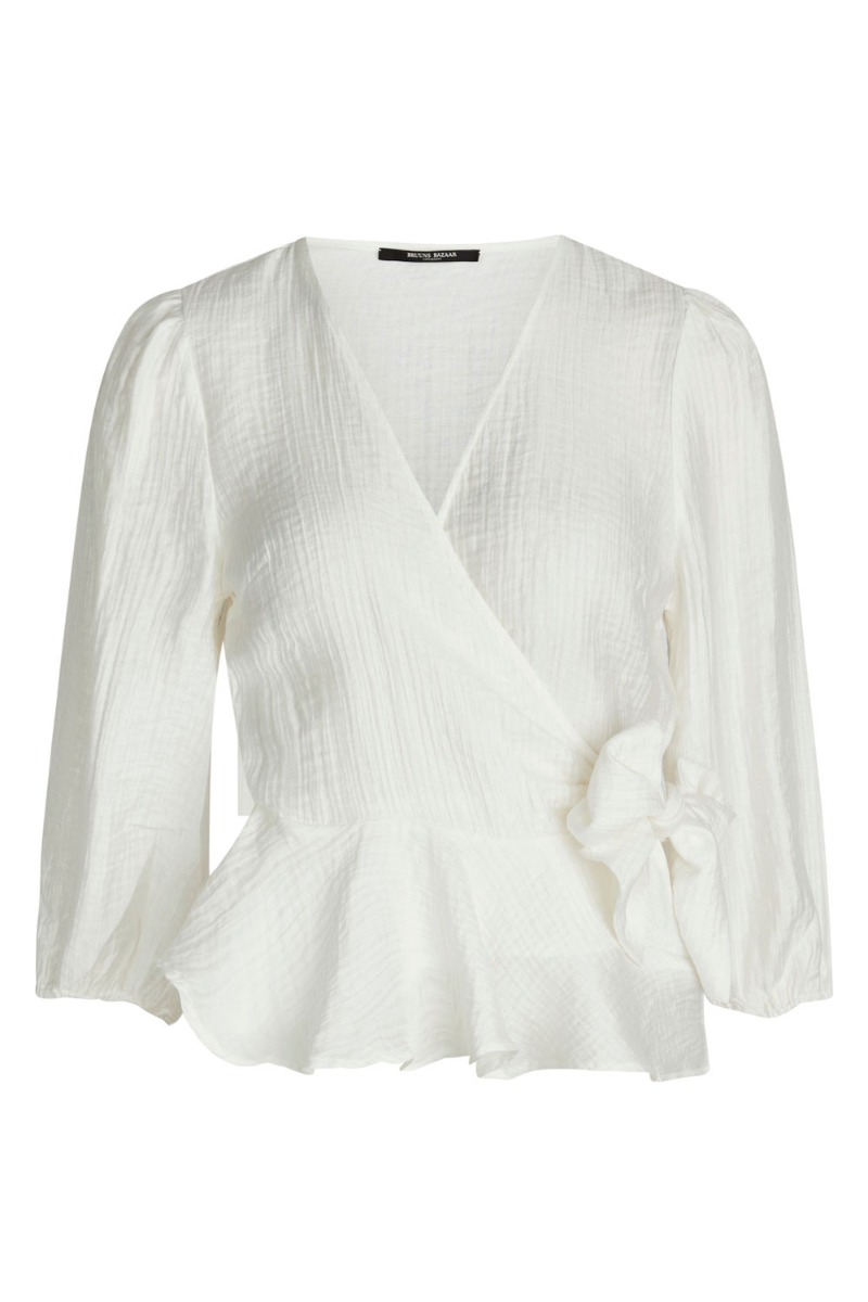 Sød feminim slå-om bluse i hvid fra Bruuns Bazaar. Blusen er i en hvid nuance med et præget mønster i materialet, som er super let og behagelig at have på. Slå-om detaljen giver en flot v-udskæring foran, samt en feminim pasform i taljen. Den har løse 3/4 ærmer med elastikkant.