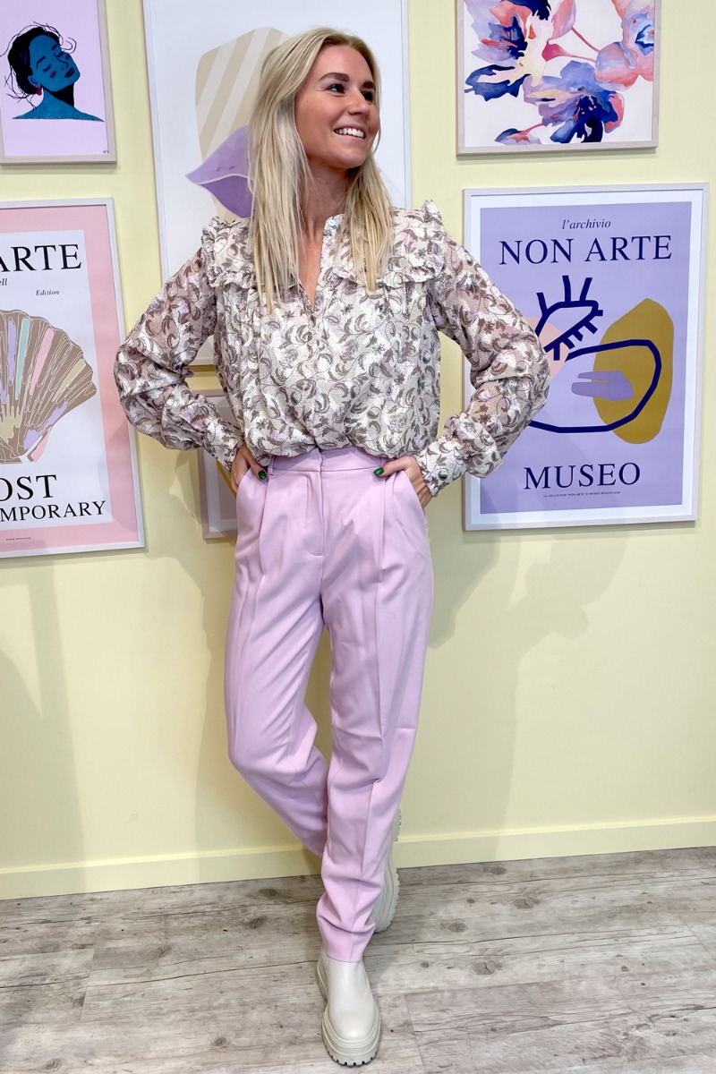 De super populære bukser fra Bruuns Bazaar i den perfekte model, vi alle elsker til både hverdag og fest. Bukserne er den klassiske model CindySus fra Bruuns Bazaar dog med lidt ekstra længde i benen end den klassiske CindySus Dagny model. Her er bukserne i en smuk lavendel nuance. Pasformen er afslappet med pressefold foran og fast linning i livet. Style dem med en bluse i samme nuancer.