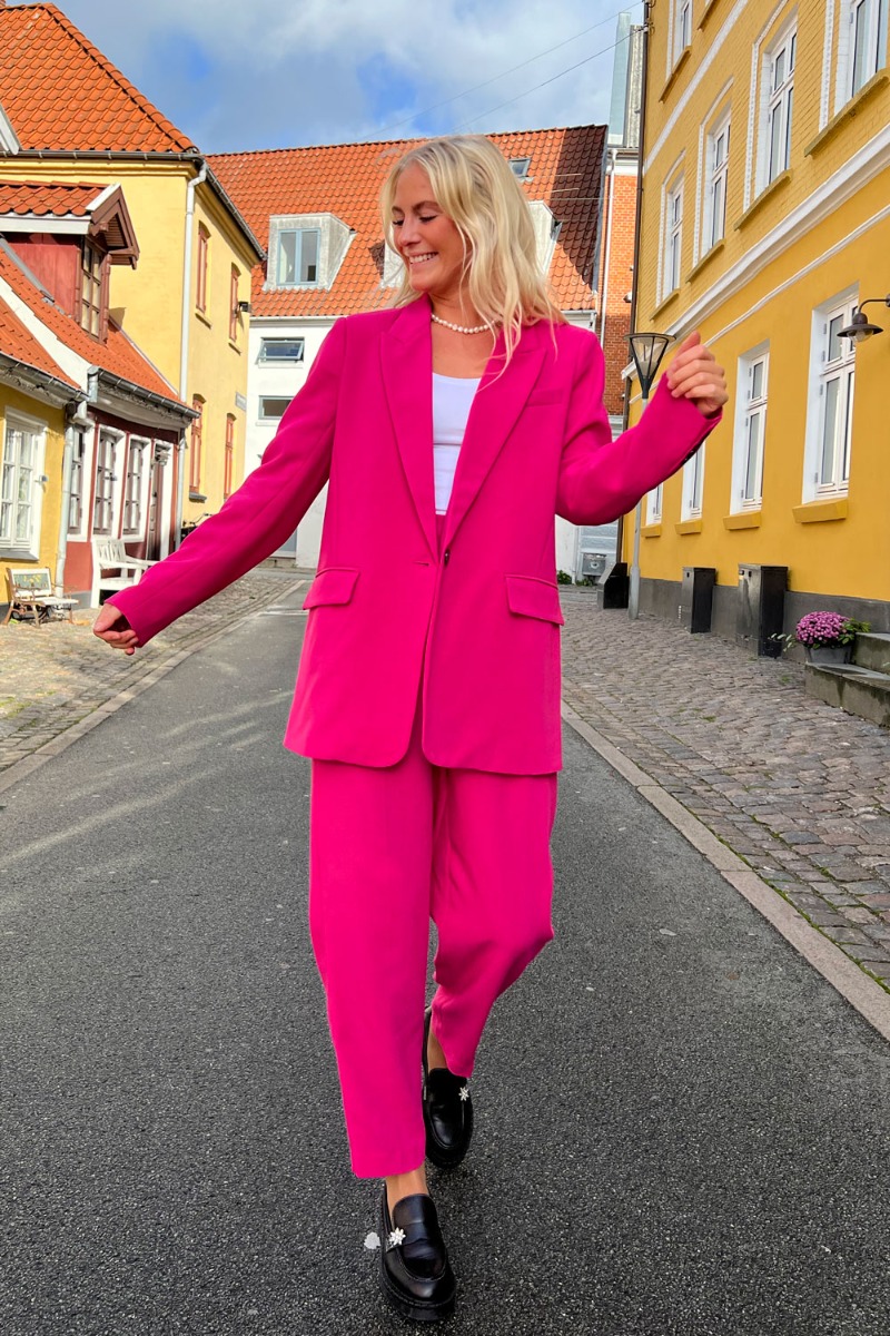 Cindysus bukser fra Bruuns Bazaar i den flotteste PINKE farve. Bukserne har den klassiske cropped pasform som vi kender den med pressefold foran og fast linning der knappes foran. De er utrolig behagelige at have på og kan styles med den matchende blazer i samme farve.