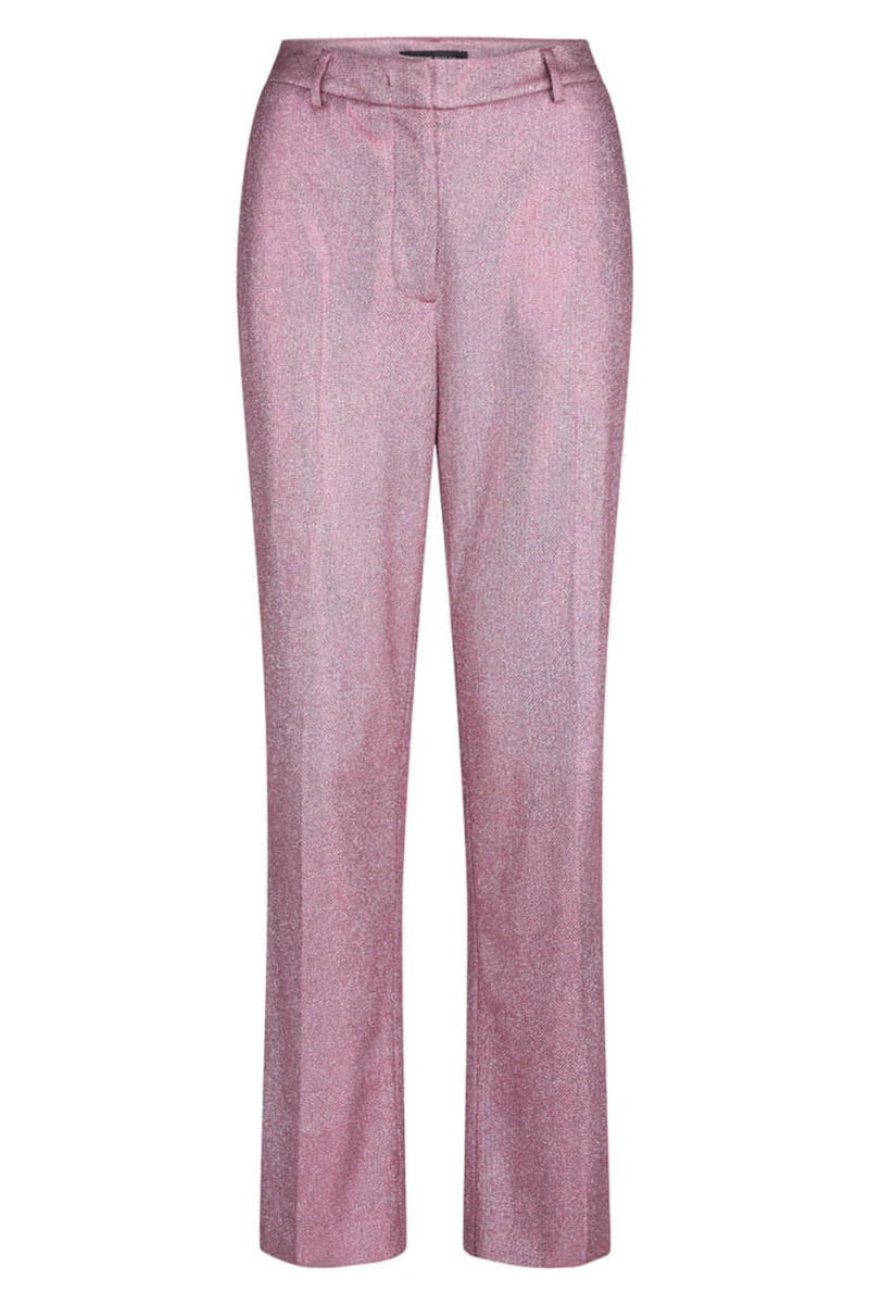 Virkelig smukke glimmerbukser fra Bruuns Bazaar i en flot rosa nuance. Bukserne er lige i benene med et løst snit og pressefold foran. De har fast linning der lukkes med skjult knaplukning foran. Style dem med den matchende blazer og en flot enkel stilet til de kommende bryllupper og fester.