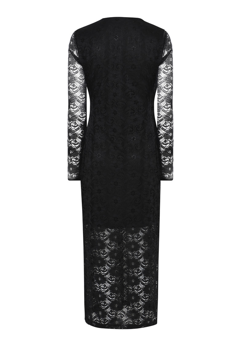 Sort lang kjole i gennemsigtigt materiale fra Bruuns Bazaar. Denne kjole er lavet i det smukkeste blonde-lignende materiale som giver et extra look. Kjolen går til fødderne og har længe ærmer, men med en inderkjole som går til knæne og ingen ærmer har, hvilket er med til at give det flotte look.