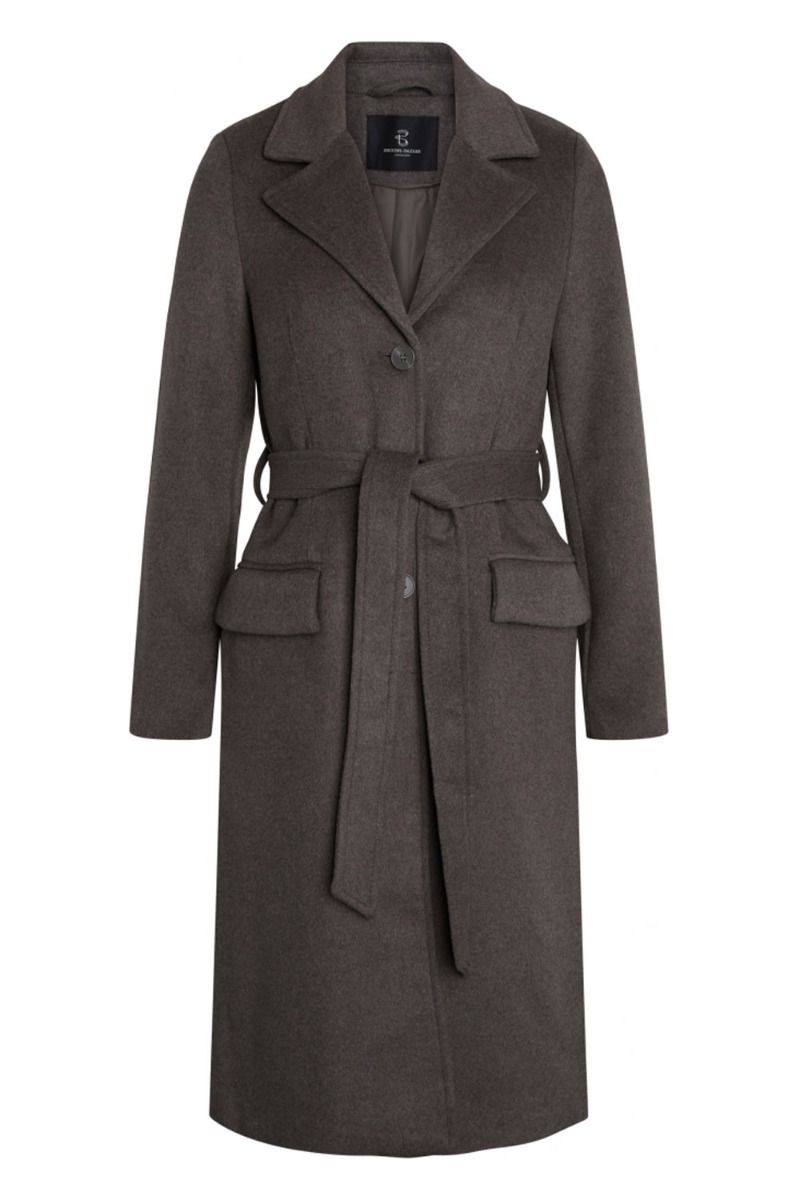 Klassisk frakke fra Bruuns Bazaar i den smukkeste brun melleret farve. Jakken er lavet af et bæredygtigt uldmateriale med bælte i taljen. Jakken knappes foran og har to lommer der er riet sammen ved køb - de kan ries op ved brug af jakken.