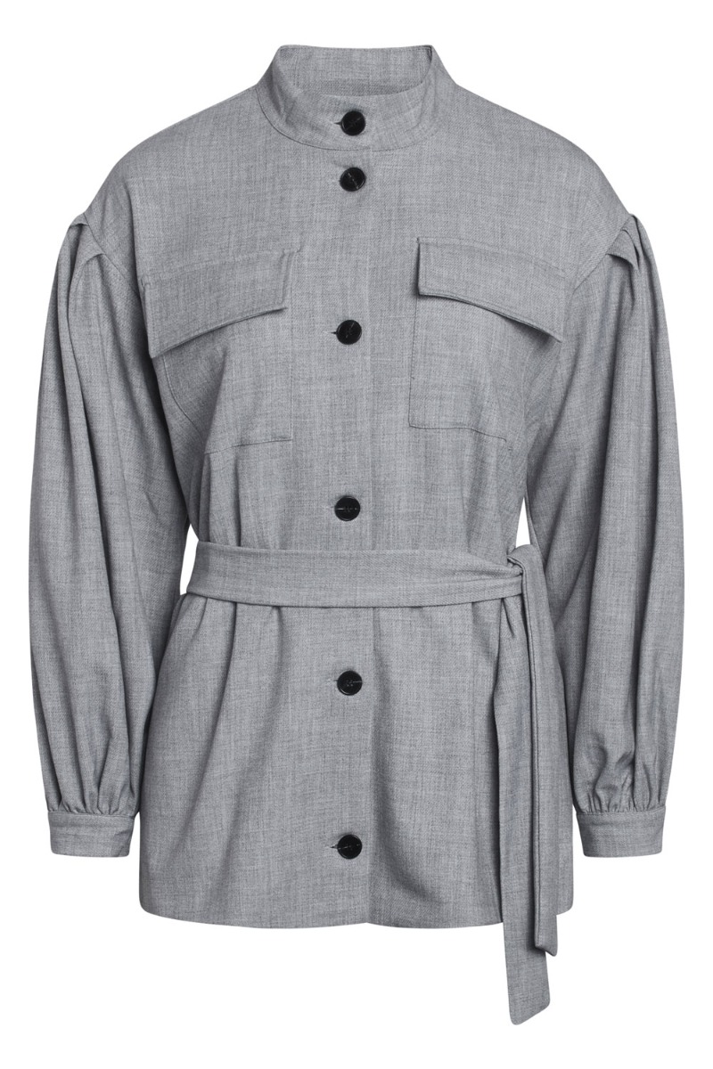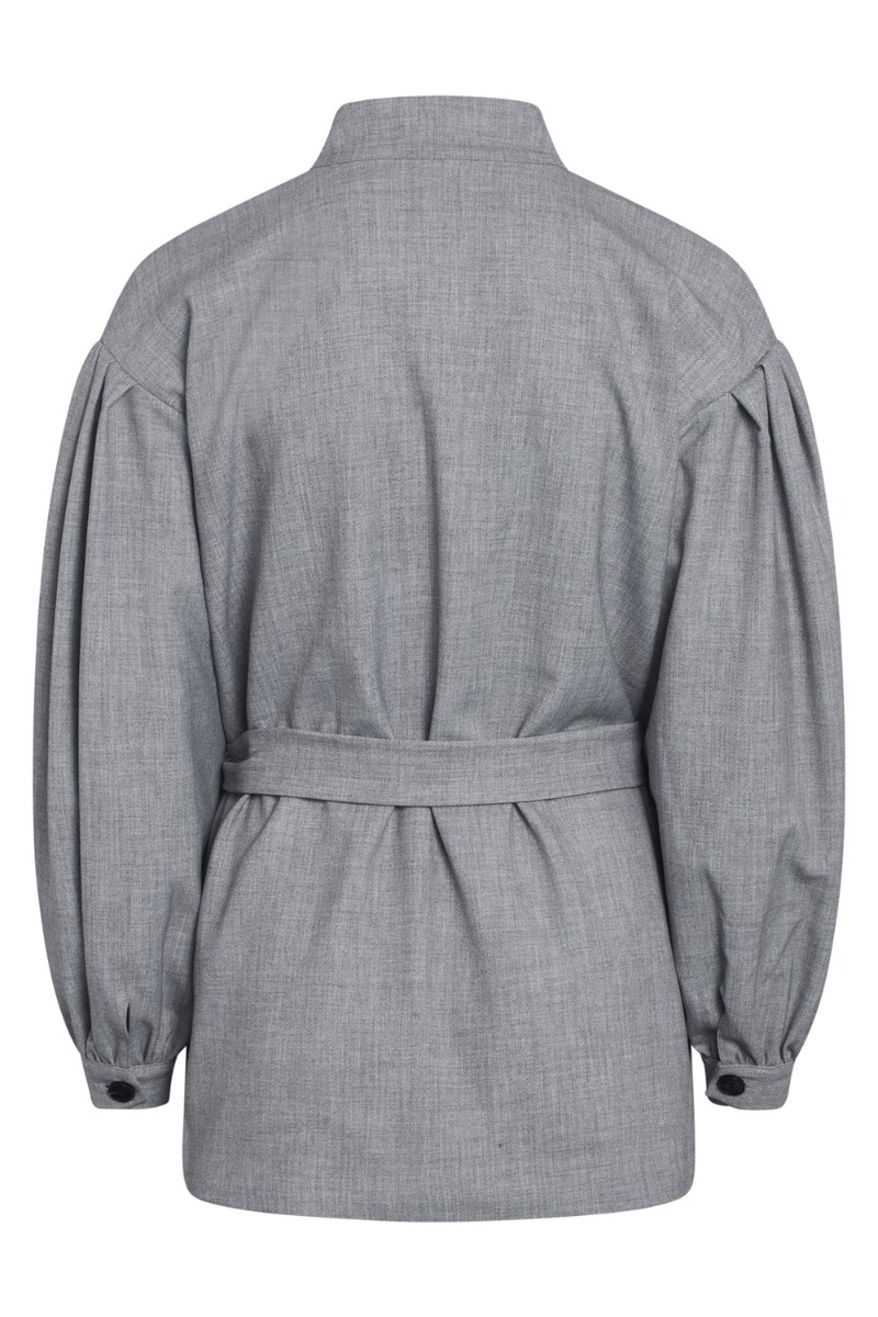 Grå skjorte fra Bruuns Bazaar med pufskulder og fine detaljer. Skjorten lukkes med knapper foran og har bindebånd med til at skabe forskellige looks og give en feminin talje. Den kan bruges som en lille jakke også og har matchende bukser.