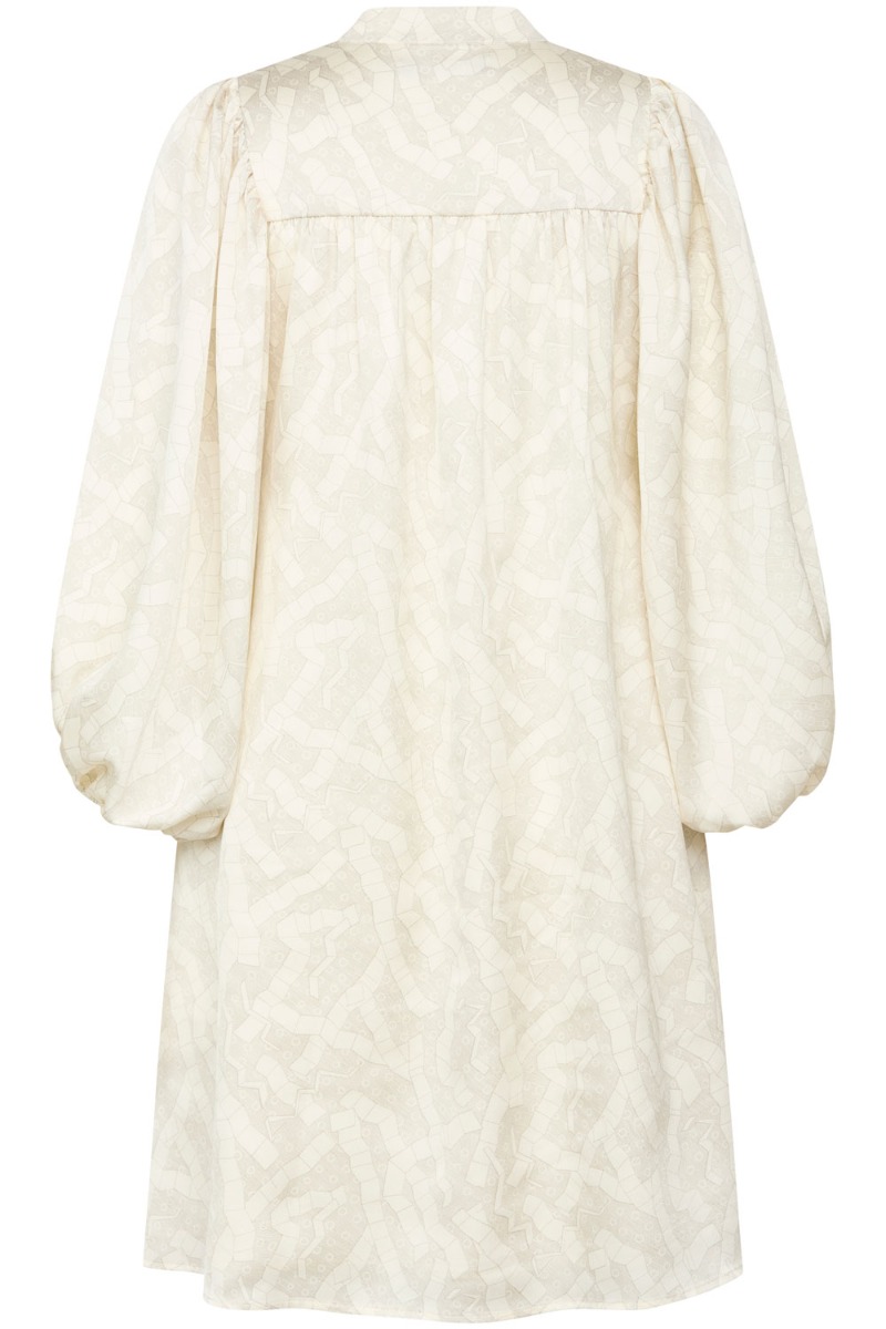 Skøn festkjole fra Bruuns Bazaar i smuk råhvid nuance med flot grafisk print. Kjolen har en rummelig pasform med knapper hele vejen ned, samt løstsiddende ballonærmer. En ammevenlig kjole perfekt til julens fester og anvendelig igen til mange flere sæsoner!