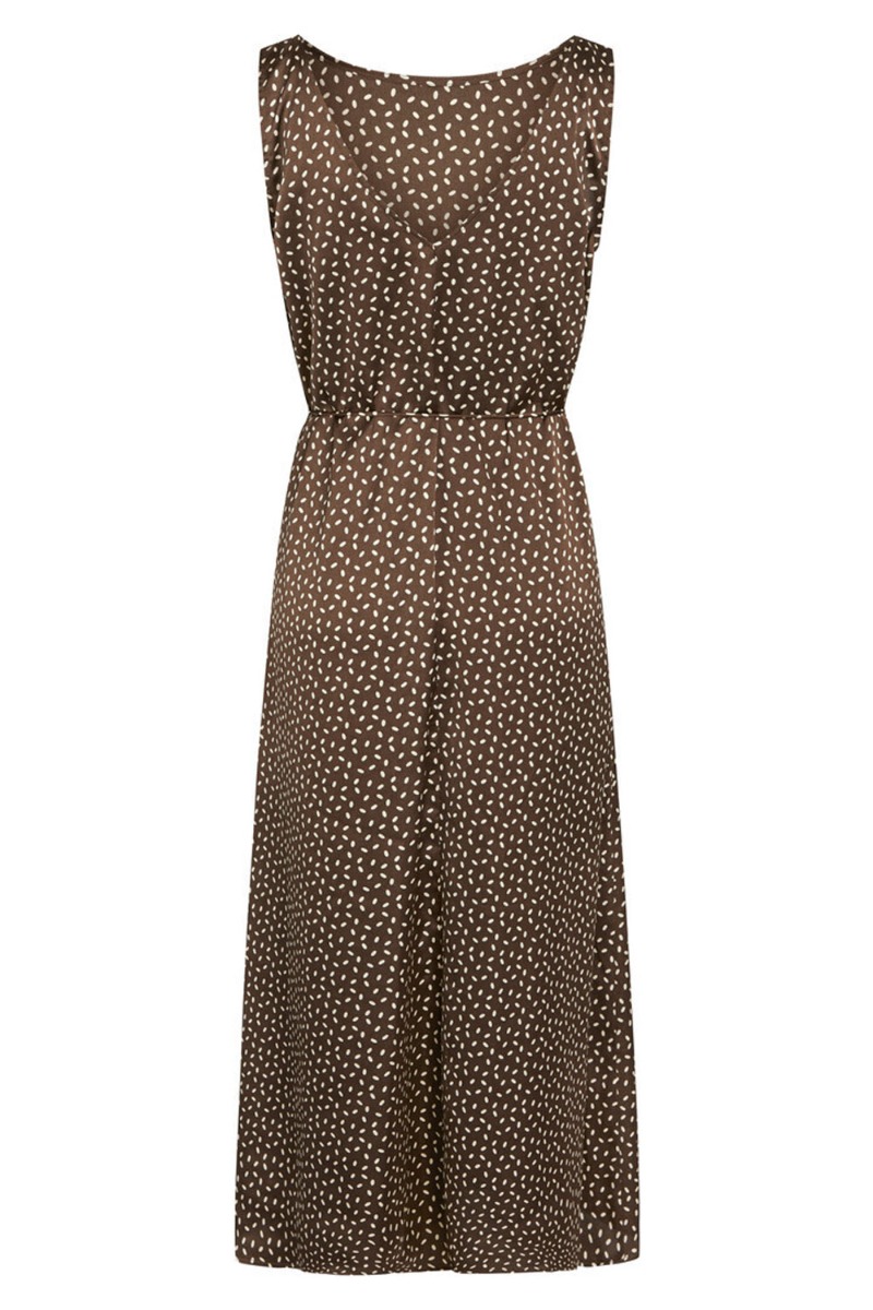 En fin kjole fra Bruuns Bazaar i brun med s må hvid prikker. Den er lang med V udskæring bagtil. Derudover er den et lille smalt bånd som er lavet i samme stof. Der er slids i bunden i den ene side. Kjolen findes også i hvid.