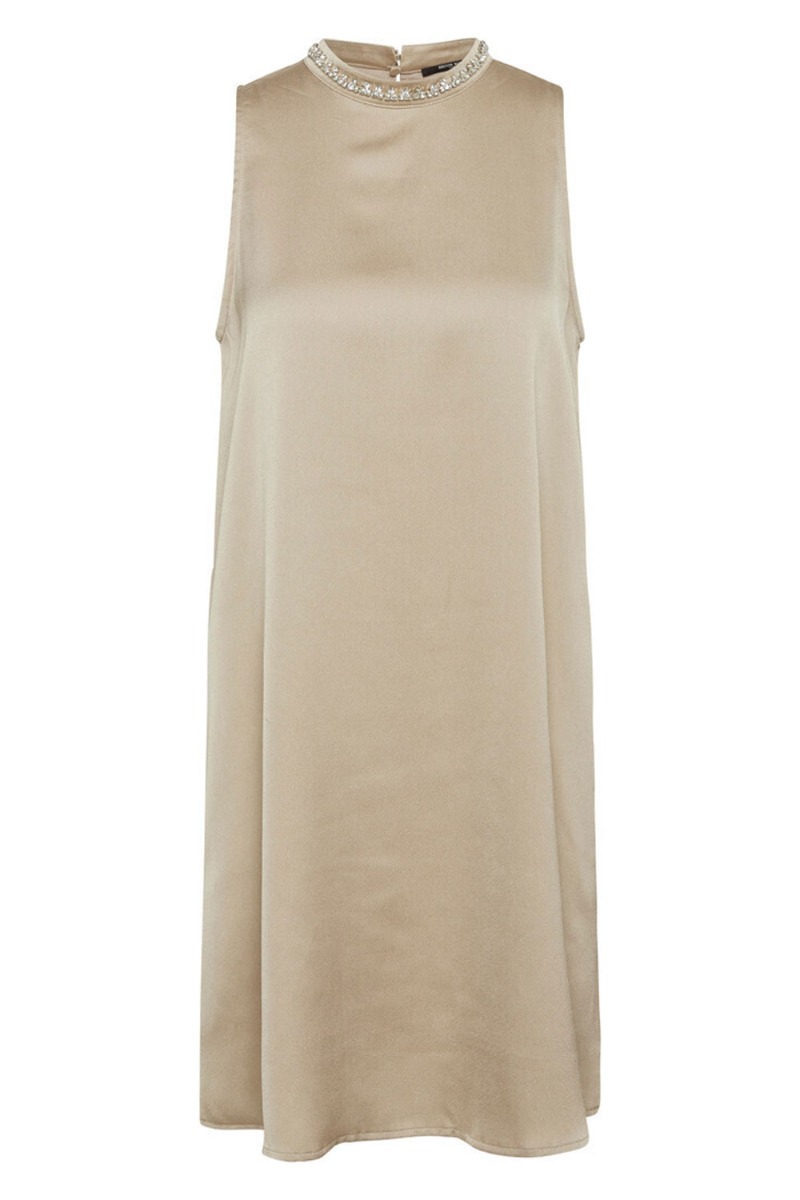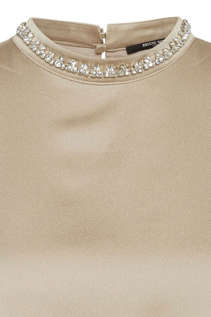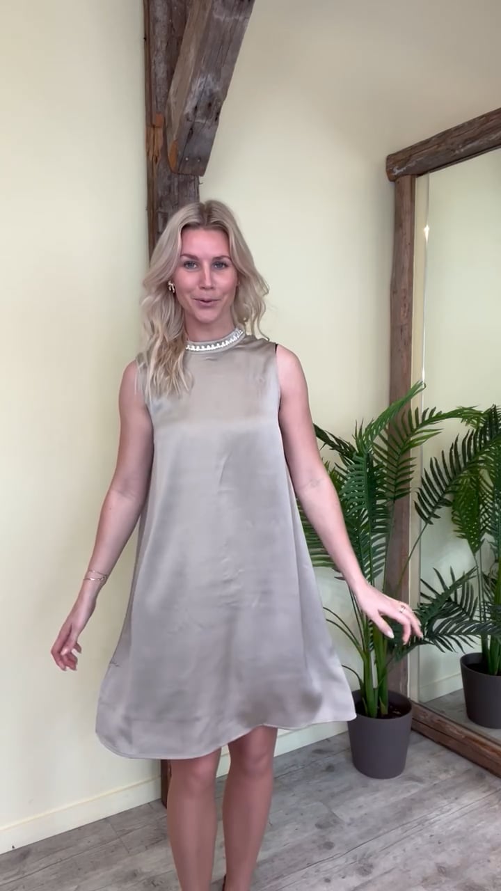 En fin kjole fra Bruuns Bazaar i en smuk brun farve med satin look i stoffet. Den har en fin detalje ved halsen, hvor der sat små sten. Derudover er den løs i pasformen samt foret så den føles behagelig at have på hele dagen. Fin til fest med et par stiletter.