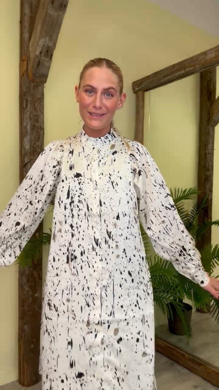 Denne smukke kjole er perfekt til et festligt arrangement og er kommet i en dejlig lækker kvalitet med satin look. Den er fra Bruuns Bazaar og mønstret i sort print. Den kina krave og knappes med en skjult knpalukning foran - derfor er den også ammevenlig. Den er foret så den ikke er gennemsigtig og man nemt bruges både med høje og flade sko.