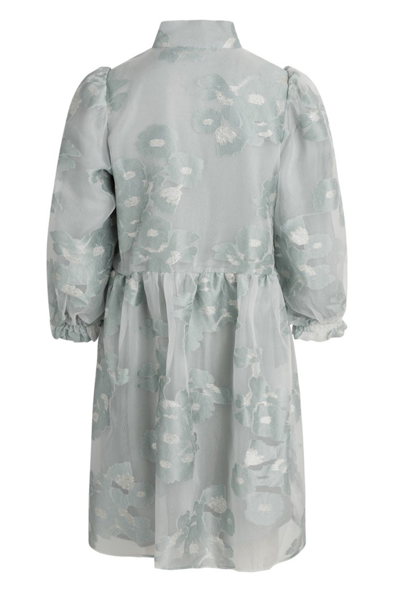 En rigtig prinsessse kjole fra Bruuns Bazaar i den fineste pasform med en tydelig syning ved livet der giver en sød to-delt-effekt. Kjolen er lavet i et transparent materiale der er foret indvendigt i en helt sart blå nuance med sølv glimmer detaljer. Foran lukkes den med knapper og har de fineste volumiøse 3/4 ærmer. En kjole der virkelig fortjener en stilet til de mange sensommer bryllupper og fester.