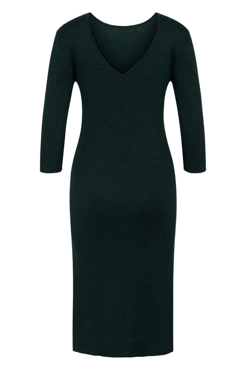 Denne strik kjole fra Bruuns Bazaar er i en tætsiddende model i den blødeste ribkvalitet med masser af stretch. Den har trekvart ærmer med v-udskæring bagtil og slidser på ærmet. Kjolen har en helt dyb grøn farve med en diskret glimmerdetalje.