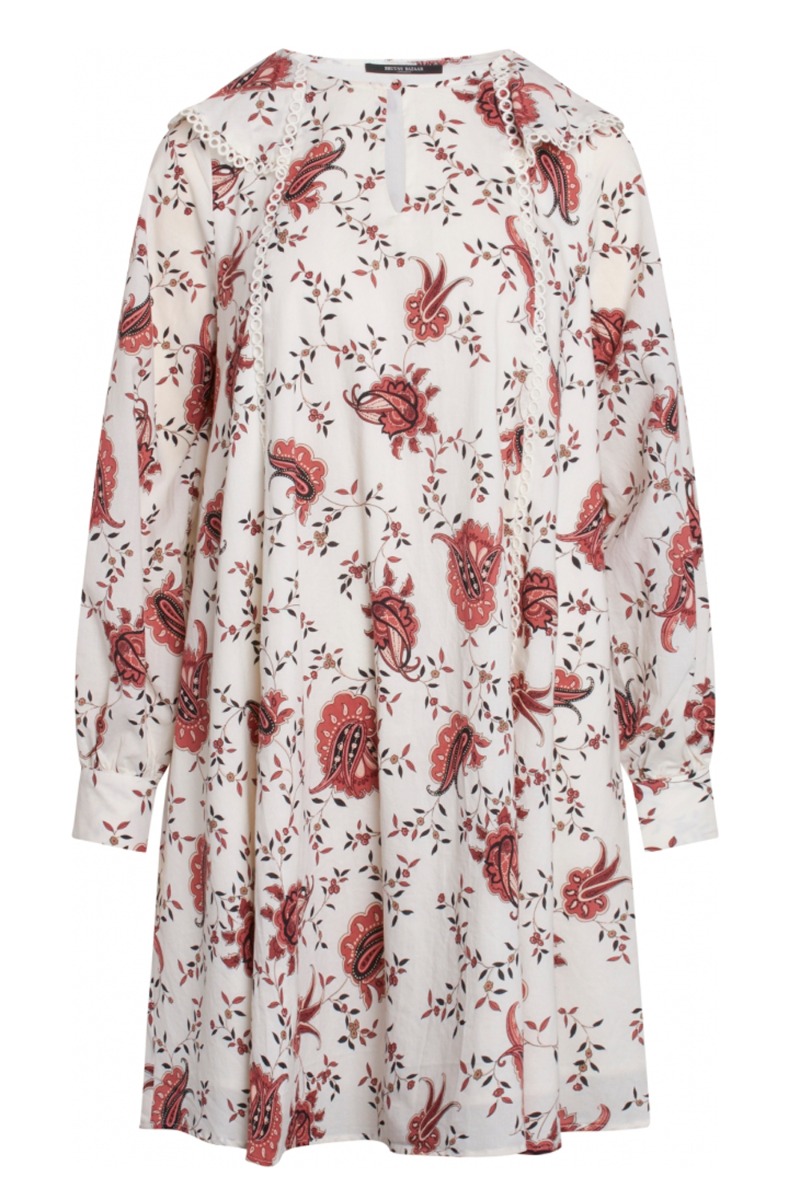 Smuk hvid kjole med print fra Bruuns Bazar. Kjolen har lange ærmer der afsluttes med en fast kant som på en skjorte. De flotte broderidetaljer og kraven giver kjolen et helt unikt look. Ved halsen knappes kjolen med en strofbetrukket knap over en dråbeformet åbning. Kjolen har et løst A-snit og falder rigtig flot.