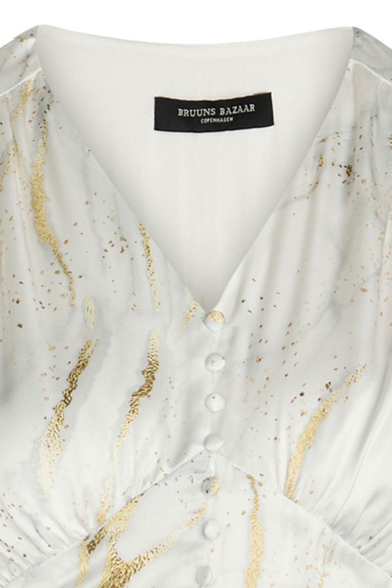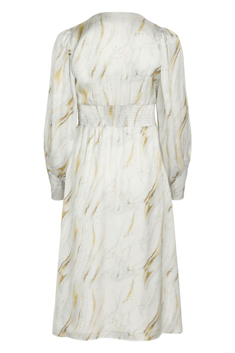 Smukkeste mellemlang kjole fra Bruuns Bazaar i hvid der er designet med et guld grafisk print. Kjolen er med v-udskæring, synlig bred talje og smockeffekt bagpå og ved håndleddet der får kjolen til at sidde som en drøm. Den er foret og super behagelig at have på med skjult lynlås i siden. Denne kjole fortjener en flot stilet eller sko til de mange fine fester.