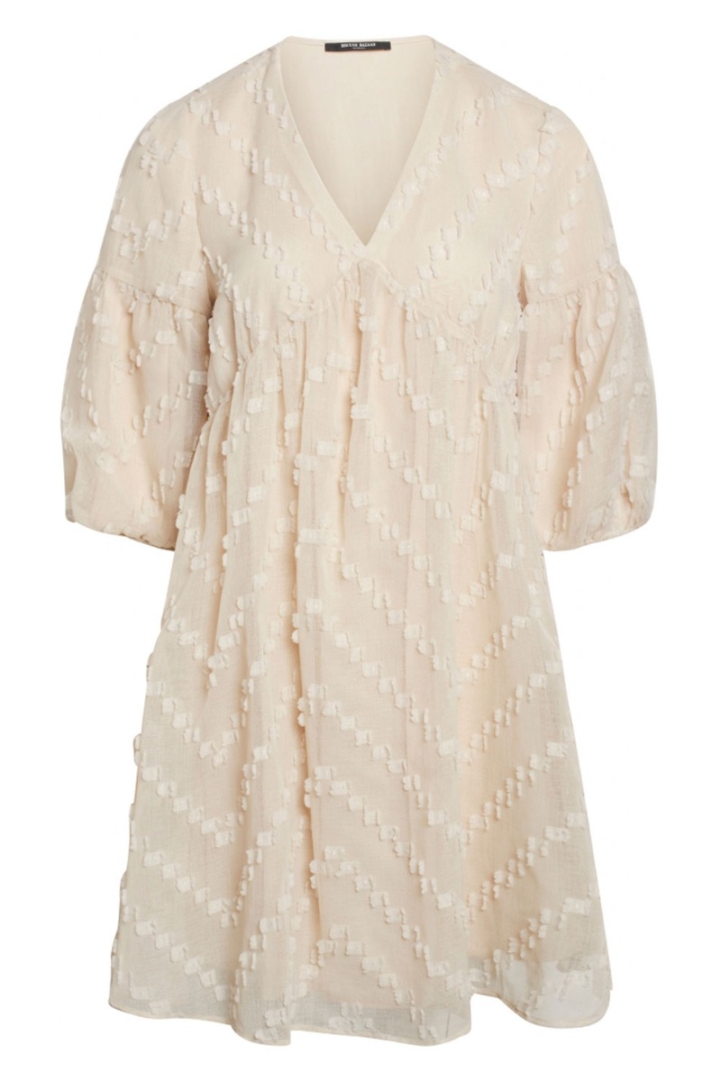 Den skønneste kjole fra Bruuns Bazaar der har et helt fint elegant look. Kjolen er rummelig i et transparent materiale der er foret i den fineste lyse sandfarve. De store ballonærmer afsluttes med elastikkant og giver den fine kjole en smuk "volume" der både kan styles med en yndig stilet eller mere afslappet til en sneaks og farvet strømpe.