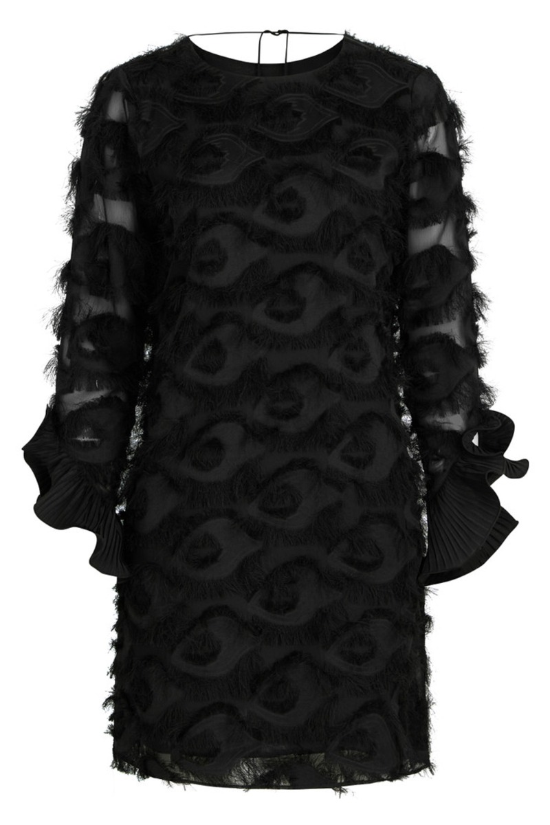 Waauw, en kjole fra Bruuns Bazaar. Kjolen er sort med det fineste fjer-lignende detaljer og print. Den er løs i modellen med en flot åben ryg der snøres i nakken med en tynd snøre. Ærmerne er designet med den flotteste flæsedetalje i enden og gør kjolen utrolig unik og smukt.
