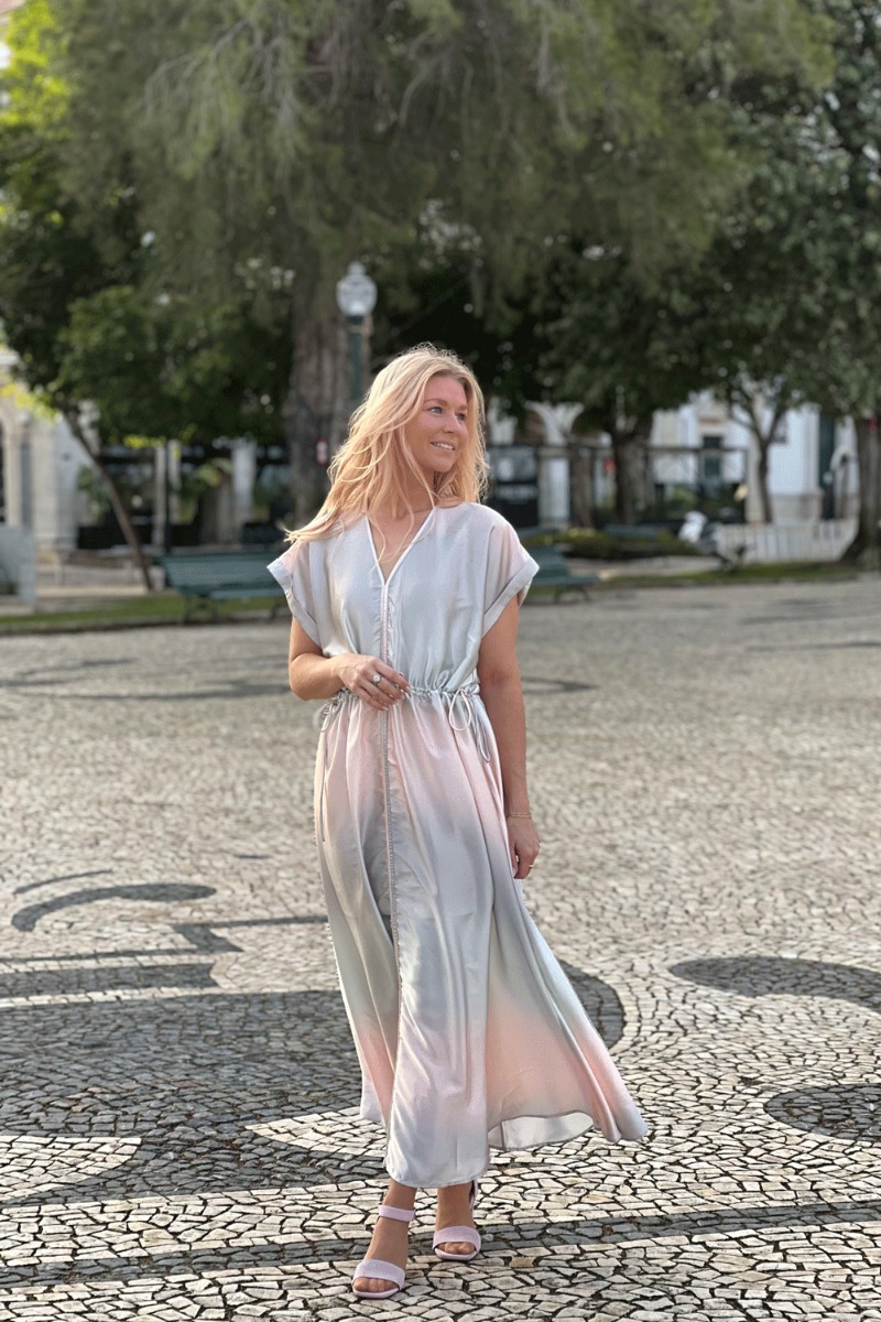 En mega fin kjole fra Bruuns Bazaar er kommet i en grå og rosa satin lignende kvalitet hvor farverne fader sammen. Den har bindebånd i taljen så den kan strammes til som du ønsker. Den er lang og med slids foran i midten. Derudover er kvaliteten dejlig let og du kan nemt bruge til både til fest og hverdag.