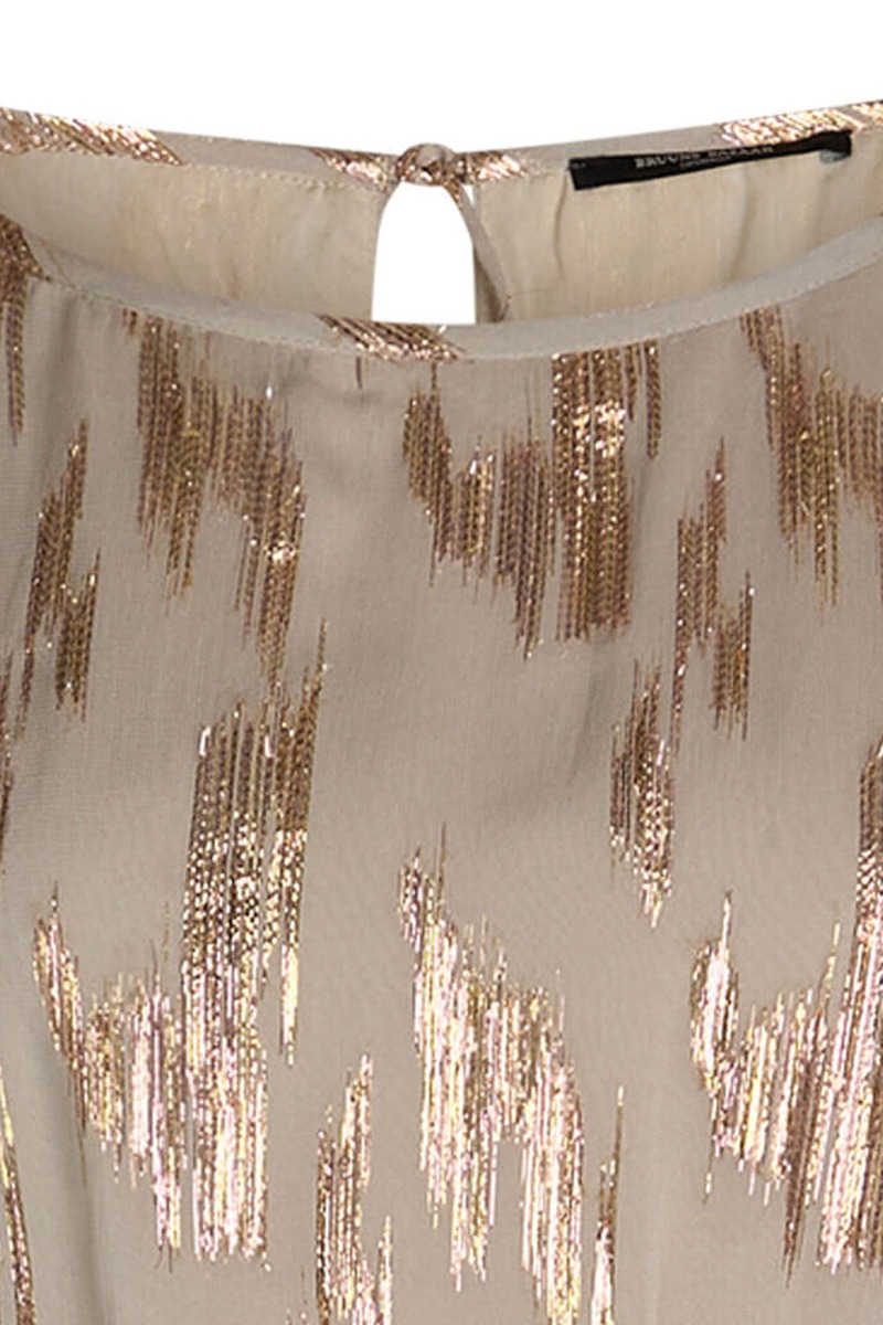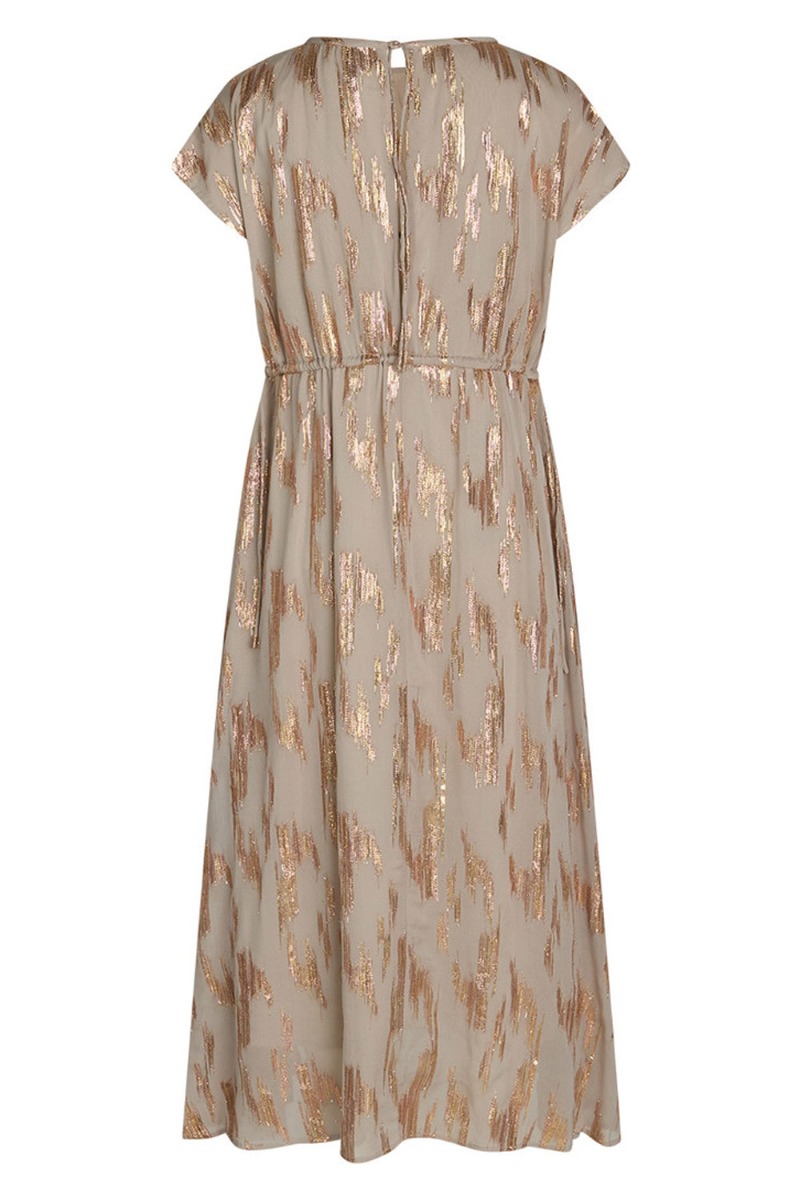 Smuk lang kjole fra Bruuns Bazaar i en behagelig kvalitet. Bundfarven er lys med et grafisk mønster med glimmertråde. Kjolen kan justeres i begge sider af taljen der giver et flot snit. Den lukkes i nakken med snøre og giver en lille åbning. Style denne kjole med en stilet til de kommende fester.