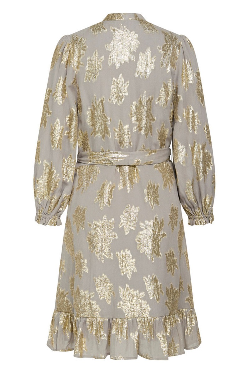 En smuk kjole fra Bruuns Bazaar er landet i grå med guld mønster. Stoffet er helt let og har en fastsyet underkjole. Derudover lukkes den med knapper foran og ned til taljen. I taljen er der et bindebånd som kan tages af. Kjolen har også lange ballonærmer som afsluttes med en elastikkant.