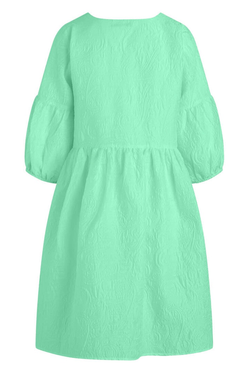 En rigtig smuk enkel kjole fra Bruuns Bazaar med de fineste små diskrete detaljer. Kjolen er rummelig i et sødt ballonsnit med en tydelig syning under barmen og i den smukkeste farve! Den er designet med et præget mønster der giver en fin shineeffekt. Kjolen er med v-udskæring og korte volumiøse ærmer. Denne kjole fortjener helt sikkert en smuk stilet til de kommende fester.