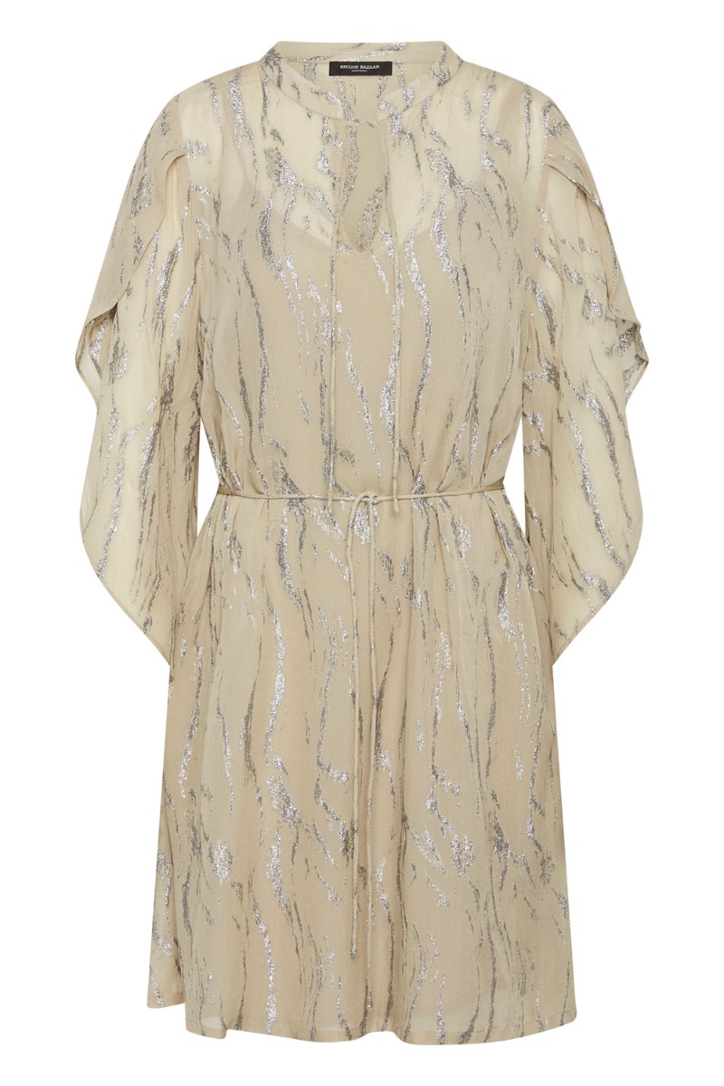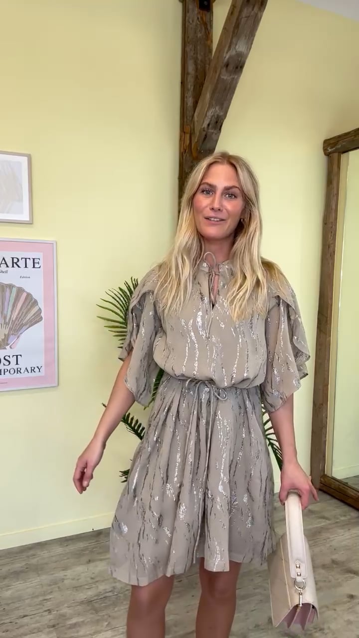 En skøn kjole fra Bruuns Bazaar i en mørk beige farve med glimmereffekt. Den er med korte løse ærmer og har en lille sløjfe detalje ved brystet. Den er med fastsyet underkjole så den ikke er gennemsigtig og er med A snit i underdel. Deruodver er der et tyndt bindebånd i taljen som nemt kan tages af.