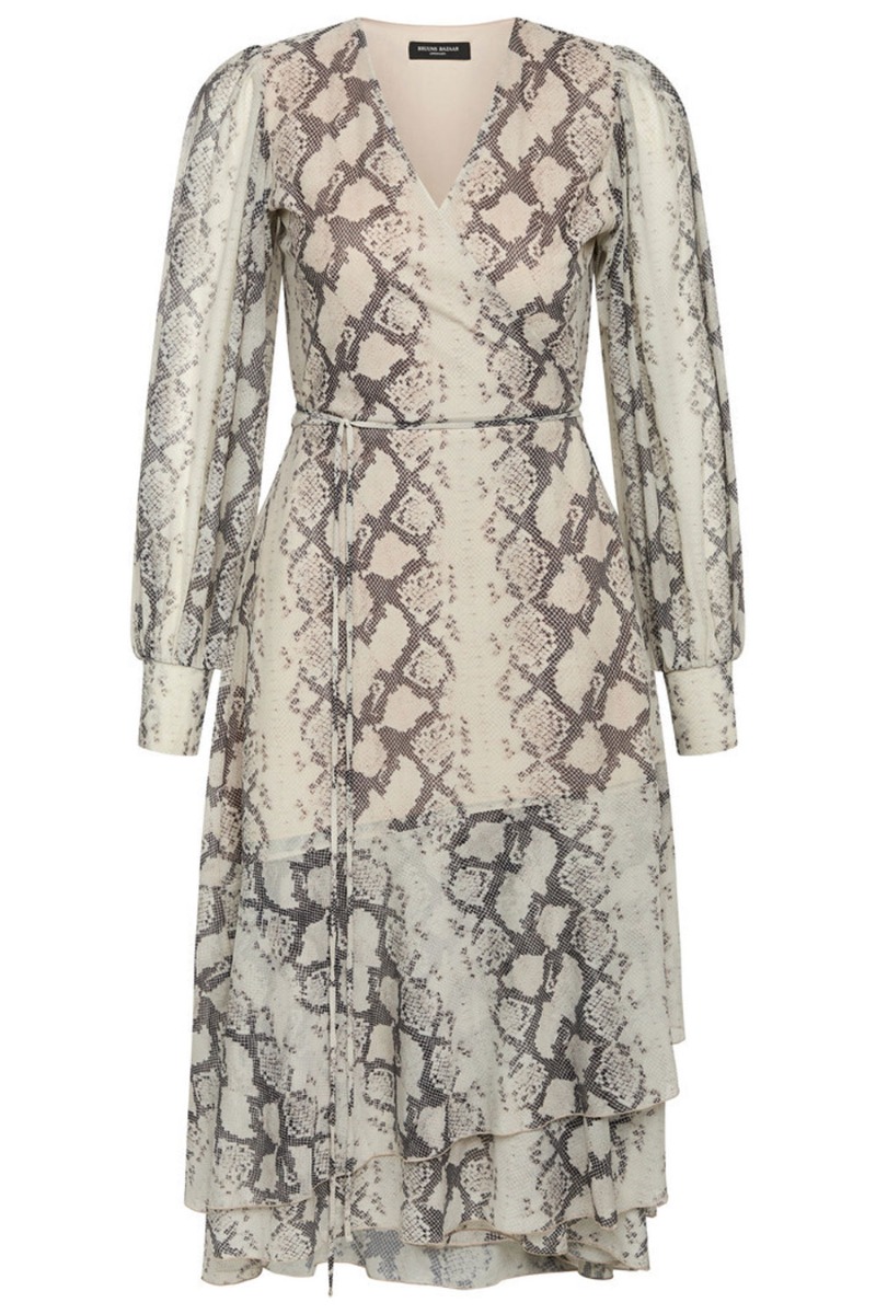 Den populære Phlox meshkjole fra Bruuns Bazaar i et sejt snakeprint. Det er en slå-om model med store ballonærmer som afsluttes med en stram kant ved håndleddet. Den er foret så den ikke er gennemsigtig og kvaliteten er tilpas tung så den falder smukt på kroppen.