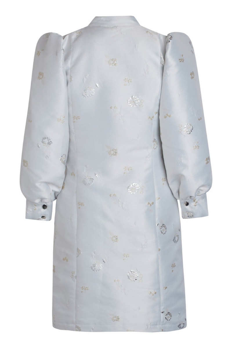 Flotteste kjole fra Bruuns Bazaar. Kjolen har en smuk mælkehvid nuance med skønne lyse blomster med sølv detaljer. Kjolen har fine sølv trykknapper med en kinakrave og 3/4 puffede ballonærmer.