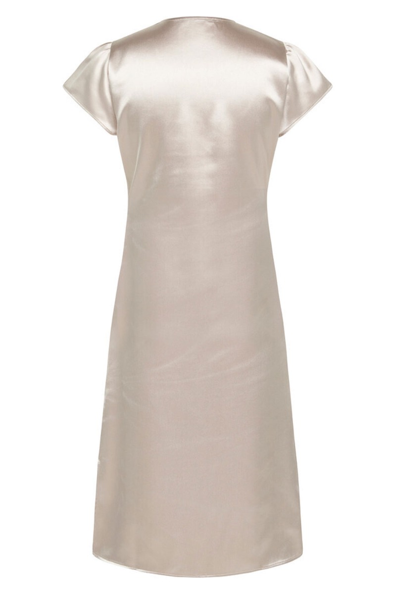 En smuk elegant kjole fra Bruuns Bazaar med slå-om design ved brystet der er riet fast. Kjolen er i en flot beige nuance med en smule shineeffekt. Den har en feminin pasform der giver en flot talje og lukkes i siden med lynlås. Kjolen er mellem lang med en lille slids i siden og super smuk til de kommende fester med en stilet.