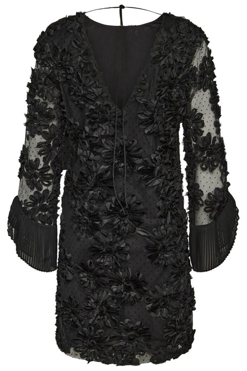 Bruuns Bazaar har lavet den smukkeste kjole i sort 3D blomsterprint. Den er foret med en fastsyet underkjole og har en sløjfe detalje i nakken, samt v-udskæring bagtil ved ryggen. Derudover er pasformen løs og ærmerne er lange og gennmsigtige. Det er helt klart en kjole der vil gøre dig til festens midtpunkt - og så er den behagelig at have på hele aftenen.