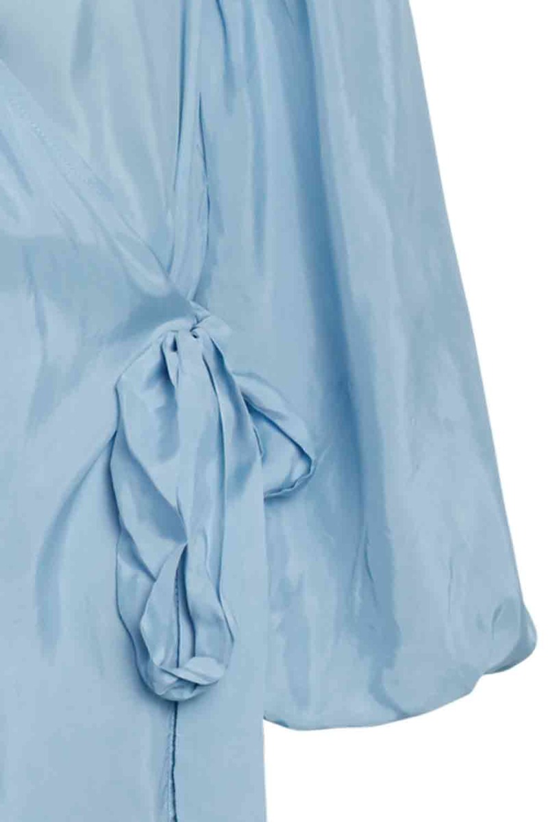 Amen se lige denne skønhed fra Bruuns Bazaar. Kjolen har den fineste lyseblå nuance med slå-om i siden, der giver en feminin v-udskæring. Ærmerne afsluttes med elastik og rynkedetalje der giver et ballon-snit. Denne kjole er virkelig oplagt med en stilet.