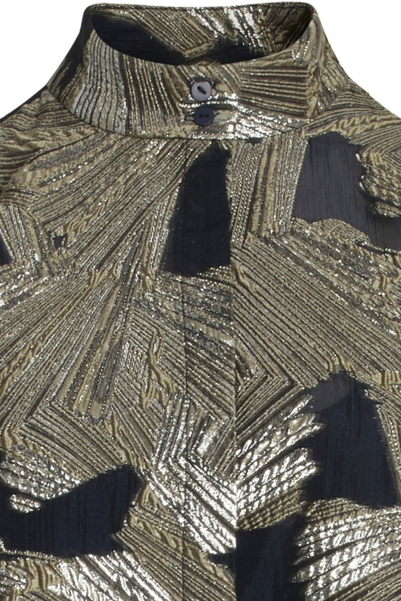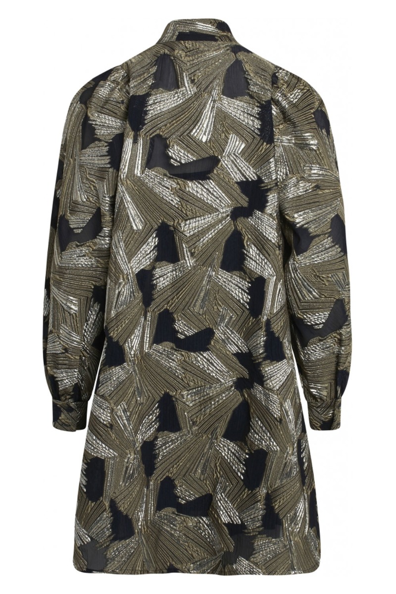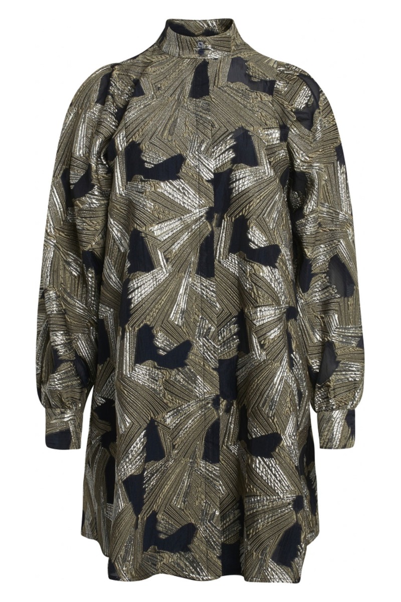 Waaaau.. Endelig er denne smukke kjole landet fra Bruuns Bazaar! Så står du og mangler kjolen så er det altså nu du skal slå til! Kjolen er sort med høj hals, ballonærmer, skjult knapper hele vejen ned og det smukkeste guld print.