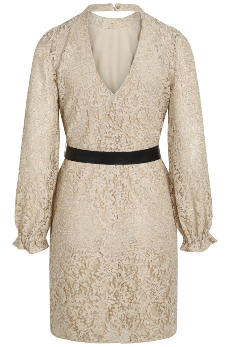 Wauw se lige den smukkeste blondekjole fra Bruuns Bazaar. Kjolen har et løstsiddende snit pyntet med blonder overalt på kjolen. Den har en smuk beige nuance og små sølv tråd som giver en flot shiny detalje. I taljen har kjolen et aftageligt sort bindebånd som kan styles efter eget ønske. Den har lange ærmer med flæsekant og se lige ryggen med den flotteste rygdetalje.
