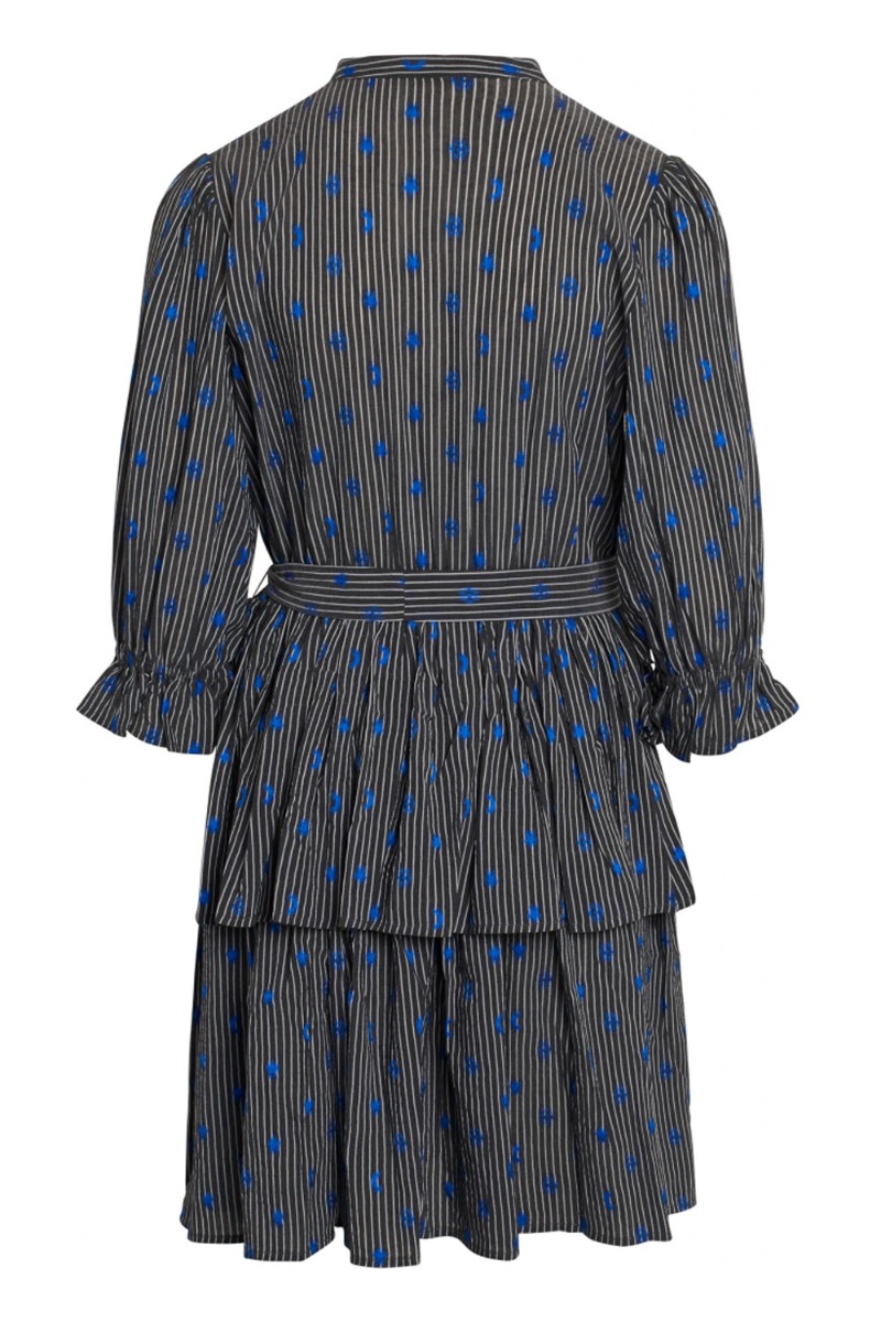 Denne model fra Bruuns Bazaar plejer at være en FAVORIT hos jer og det forstår vi virkelig godt. Den er designet i et let materiale med de smukkeste detaljer. Kjolen har et fint lille "skirt" med bindebånd i taljen og 3/4 ærmer med flæsekant. Foran har den skjulte knapper og et fint stribet mønster med små stjerner og måner i blå. Style den med en stilet eller rå lang støvle.