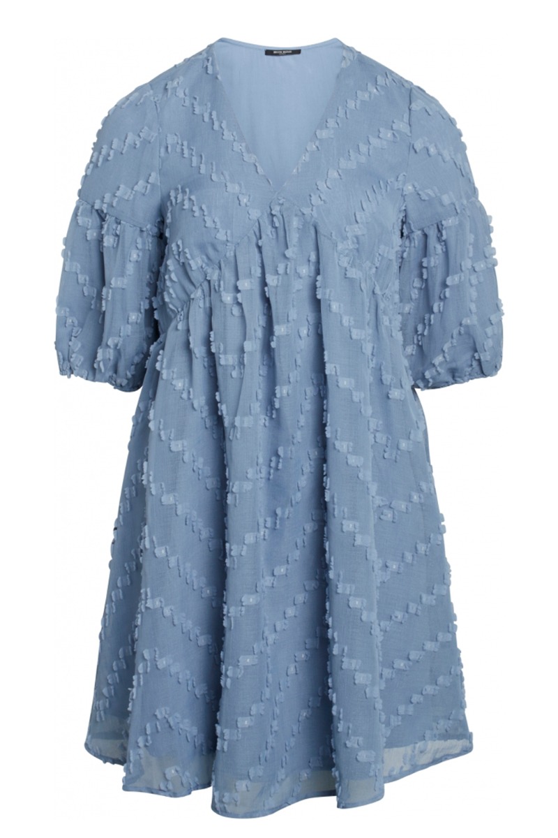 Den fineste blå kjole fra Bruuns Bazar. Kjolen har et enkelt og elegant snit med v-hals og ballongærmer. Kjolen er i et transperant materiale i blåt og foret med et lyseblåt foer. Modellen er rummelig og rigtig fin at style med stiletter eller til et par sneaks for et mere afslappet look.