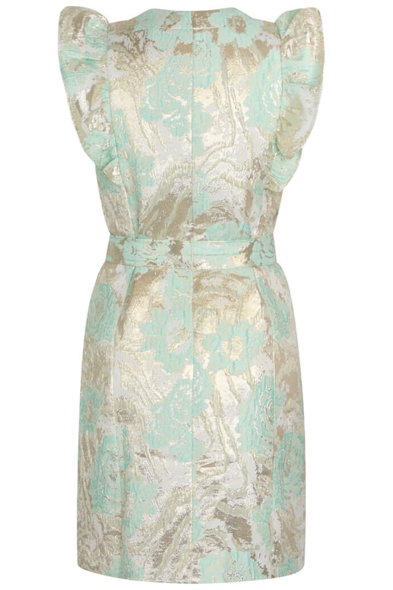 Wauw super skøn og flot kjole fra Bruuns Bazaar. En smuk festkjole som oser af forår! Den er designet i et tætsiddende snit med v-udskæring og flæseærmer. Den har aftageligt bindebånd i taljen som kan styles efter eget ønske. Den er i en smuk lysbeige bundfarve med guld shineeffekt og mintnuancer.