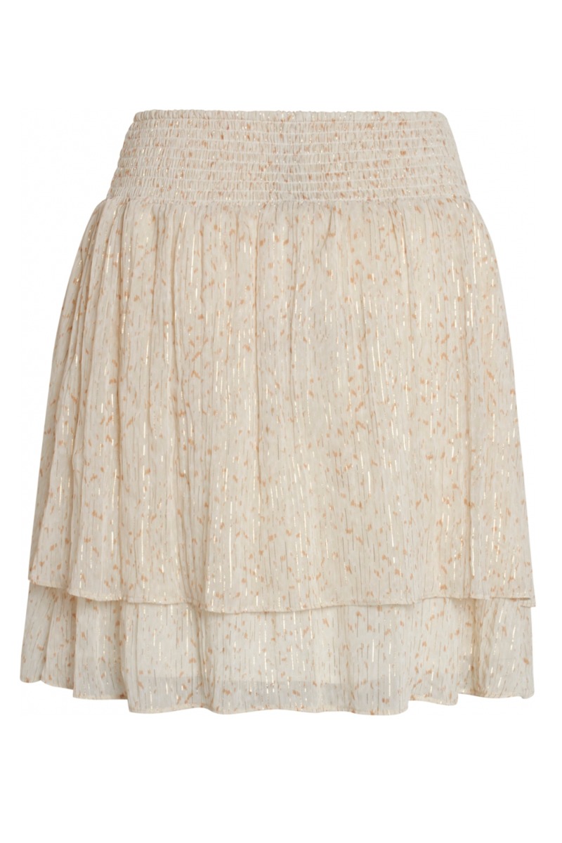 Super fin nederdel fra Bruuns Bazar i beige grafisk mønster med gulddetaljer. Nederdelen har lag på lag effekt og i taljen et bred stykke smok der giver en virkelig god pasform. Skirtet går til lige over knæeet og er så fint at style til en enkelt T-shirt eller som et rigtig festlook til skjorten i matchende print.