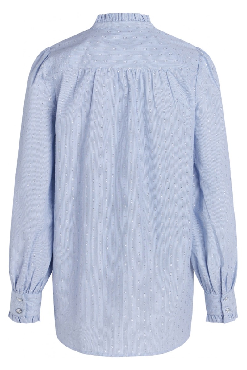 Feminin skjorte fra Bruuns Bazaar med ekstra længde bagtil end foran der giver en fin runding. Skjorten lukkes foran med en enkelt synlig knappe og skjult nedefter. Skjortens lamge ærmer har smukke flæsedetaljer ved håndleddet og små sølv bomber. Style den med en pæn buks eller jeans.