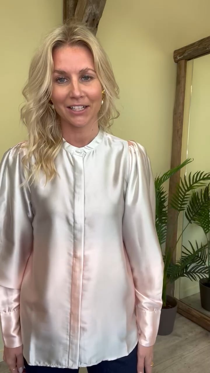 En smuk skjorte fra Bruuns Bazaar er kommet til denne sæson. Den er i en flot satin lignende kvalitet og er i en løs pasform. Derudover er den med flæse detalje bagpå og har skjult knaplukning foran samt kina krave. Den kan nemt bruges til dine favorit jeans eller til en nederdel.