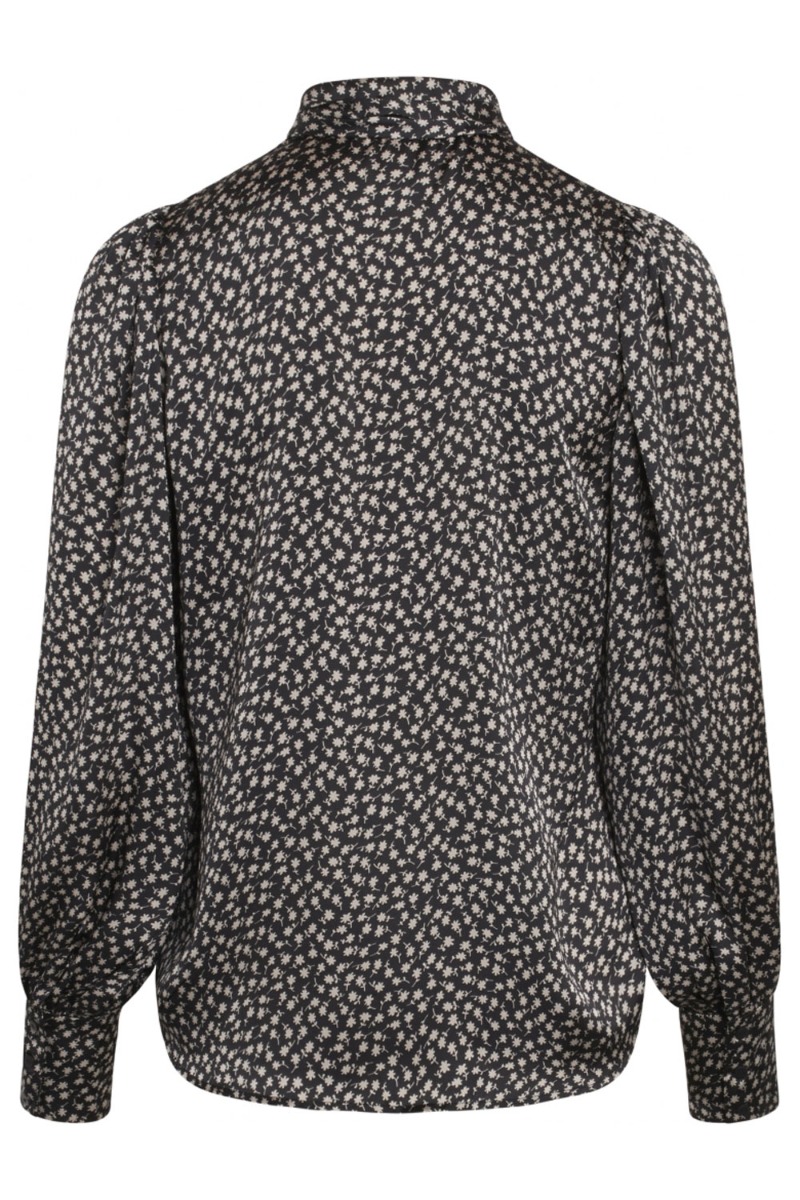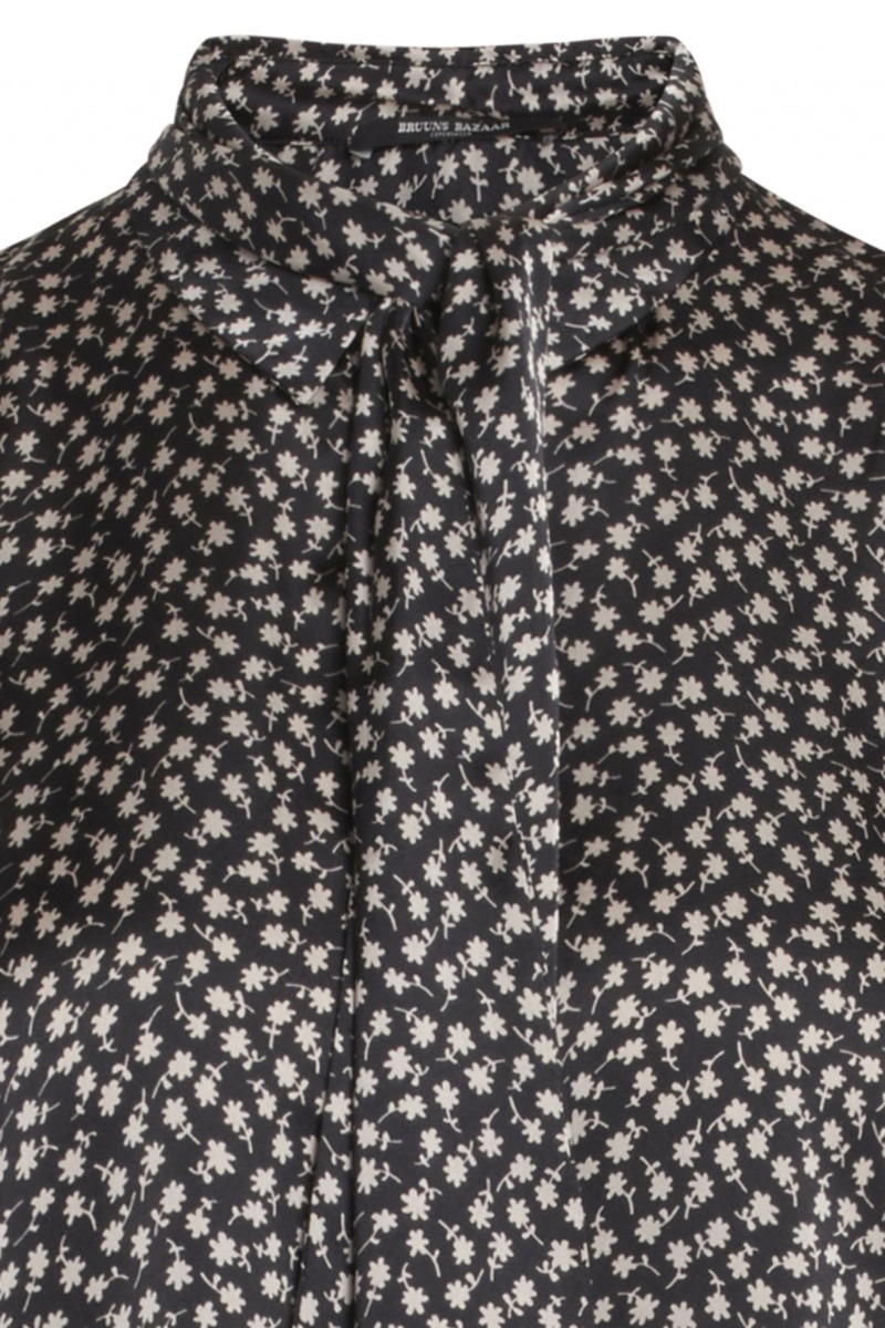 Bruuns Bazaar er virkelig indbegrebet på smukke feminine style og det ses virkelig på denne skjorte. Den har et feminin udtryk i et løst snit med knapper foran i en silkeglat overflade. Bundfarven er sort med et lille blomsterprint og har medfølgende bindebånd til kraven, der skaber en ekstra smuk detalje til dit look.