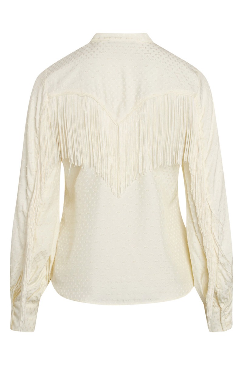 Man kan virkelig se der er blevet kredset om detaljerne på denne smukke skjorte fra Bruuns Bazaar. Skjorten har de fineste detaljer med små bomber, et lille diskret mønster og frynser bagtil. Skjorten er lavet i en let fin kvalitet med knapper foran. Den er super cool at style med en kort nederdel eller et par jeans alt efter anledning.