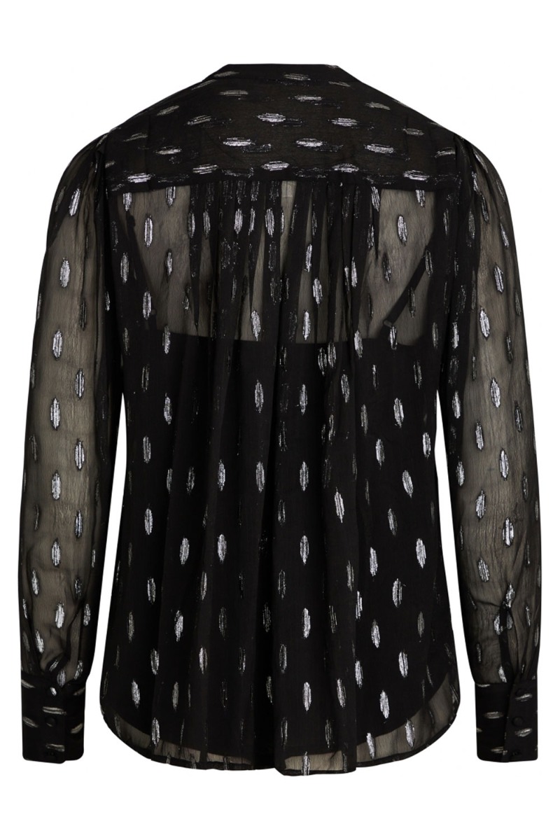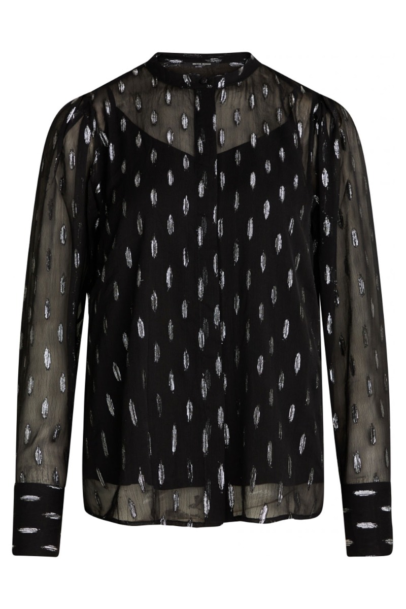 Sort feminin skjorte fra Bruuns Bazaar med sølv print. Skjorten er lavet i et transparent materiale med medfølgende top under. Den lukkes foran med stofbetrukket knapper hele vejen ned. Denne skjorte er et perfekt valg til de kommende julefester med et par "pæne" bukser til.