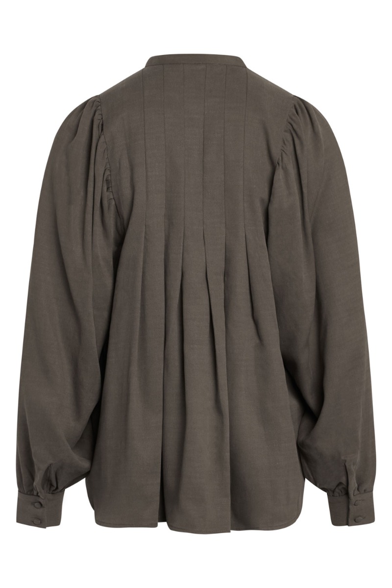 Feminin bluse fra Bruuns Bazaar med "læg" foran der skaber et smukt enkelt udtryk. Blusens runde hals lukkes foran med en enkelt synlig knap og skjulte knapper nedefter. Brug den med de klassiske CINDYSUS bukser for et enkelt feminint look.