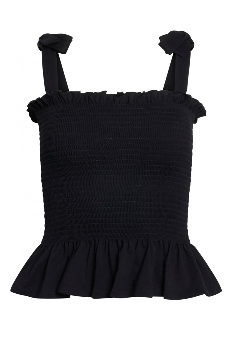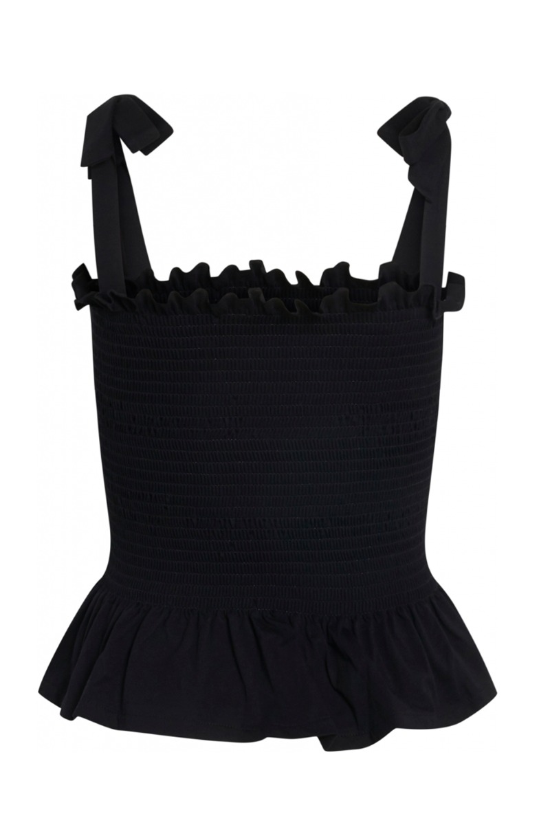 Skøn sort smock top fra Bruuns Bazar. Toppen har bindebånd på skulderne og en flæsedetalje både over brystet og i bunden af toppen. Super fin at style over en T-shirt eller bare som den er.