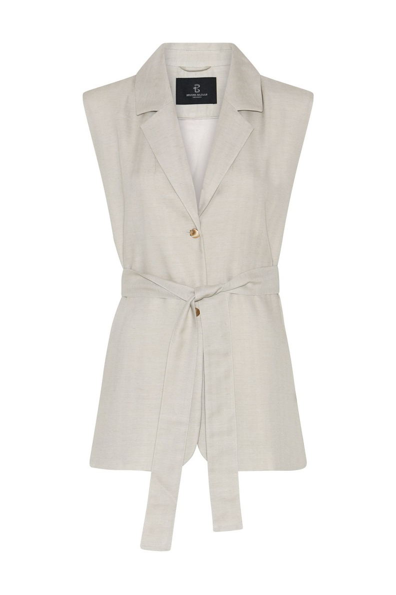 En smuk vest er landet fra Bruuns Bazar. Vesten er med helt korte ærmer, bindebånd i taljen og så to fine knapper foran, deruover har den også en krave som giver den lidt et blazere look. Style den med en t-shirt under og et par habit bukser for et cool look til hverdag!