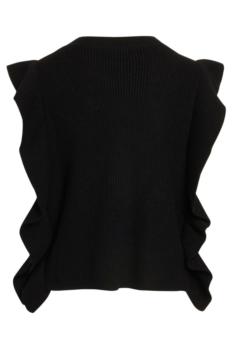 Sød strikvest fra Bruuns Bazaar i sort med de fineste flæsedetaljer i siden. Vesten kan bruges alene som top eller med en skjorte under alt efter vejr og anledning.