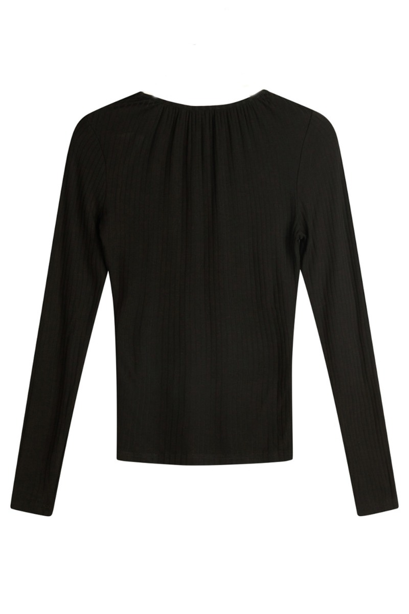 En enkel sort top fra BZR med v-udskæring og en lille hul detalje foran ved brystet. Blusen er tætsiddende med lange ærmer og en fin bluse at bruge til både festlig anledning og hverdag.