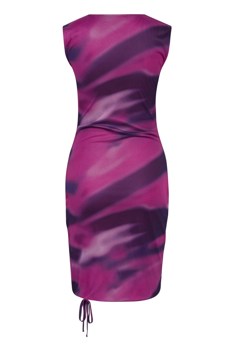 Kjolen her er en model der plejer være utrolig populær i et helt nyt lilla swirly print. Den er tætsiddende i en dejlig mesh kvalitet der er med stretch. Foran har kjolen rynkedetalje der gør den sidder super flot på kroppen og kan justeres alt efter eget ønske.