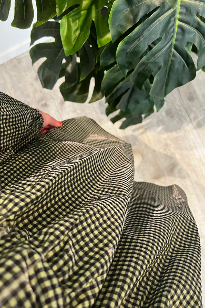 BZR kjole i et enkelt design med ternet mønster i army og sort. Kjolen har det sødeste ballonsnit med en tydelig syning under barmen der giver et fint udtryk. Den har en diskret shineeffekt og afsluttes med elastik ved ærmet.