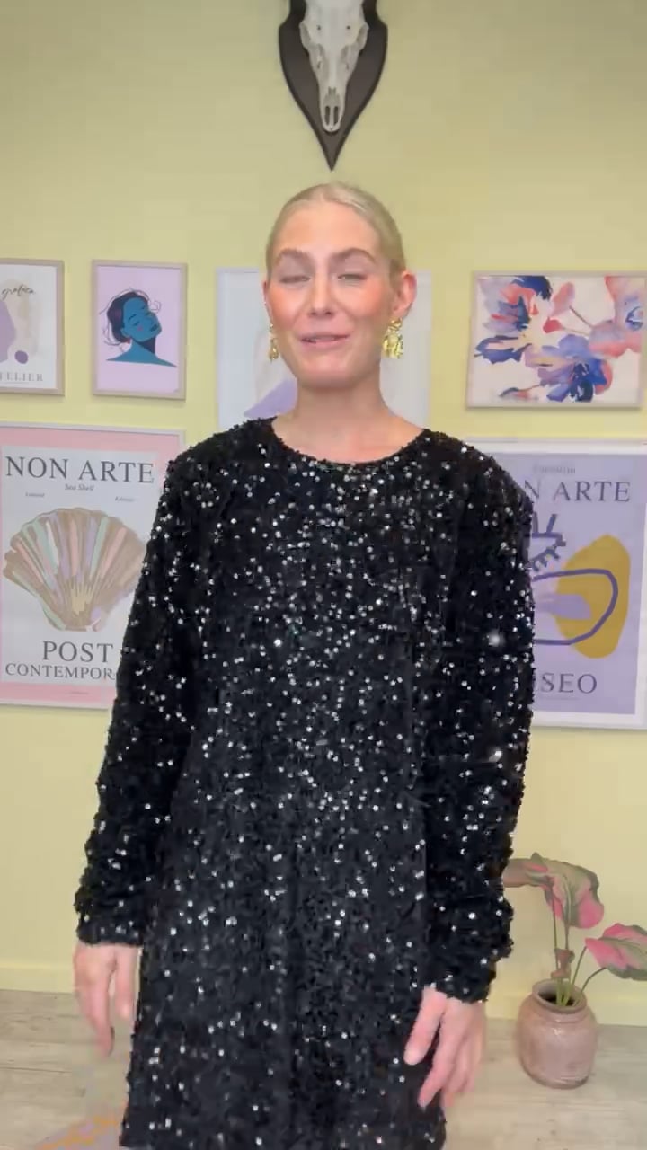 WAAUW.. En smuk paillet kjole fra BZR i sort i et feminint enkelt snit. Kjolen er løs med lange ærmer og klassisk rund udskæring der lukkes i nakken med en enkelt knaplukning og skaber den flotteste åbning bagtil. Kjolen har en lille skulderpude der gør kjolen falder lige som den skal. En kjole der virkelig fortjener en smuk stilet til de mange festlige anledninger.