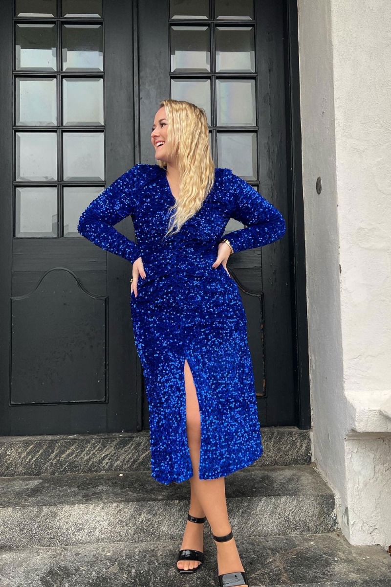 OH MY.. Hold på hat og briller, den SMUKKESTE kjole fra BZR er landet og det er en kjole man bare skal se i virkeligheden. Kjolen er i den flotteste blå farve med pailletter overalt. Modellen er utrolig feminin med rynkedetalje i midten foran og en smuk v-udskæring samt lange ærmer og en lille skulderpude. Kjolen sidder til med stretch og falder løst i bunden med slidsdetalje. en rigtig WAAUW kjole efter vores mening!