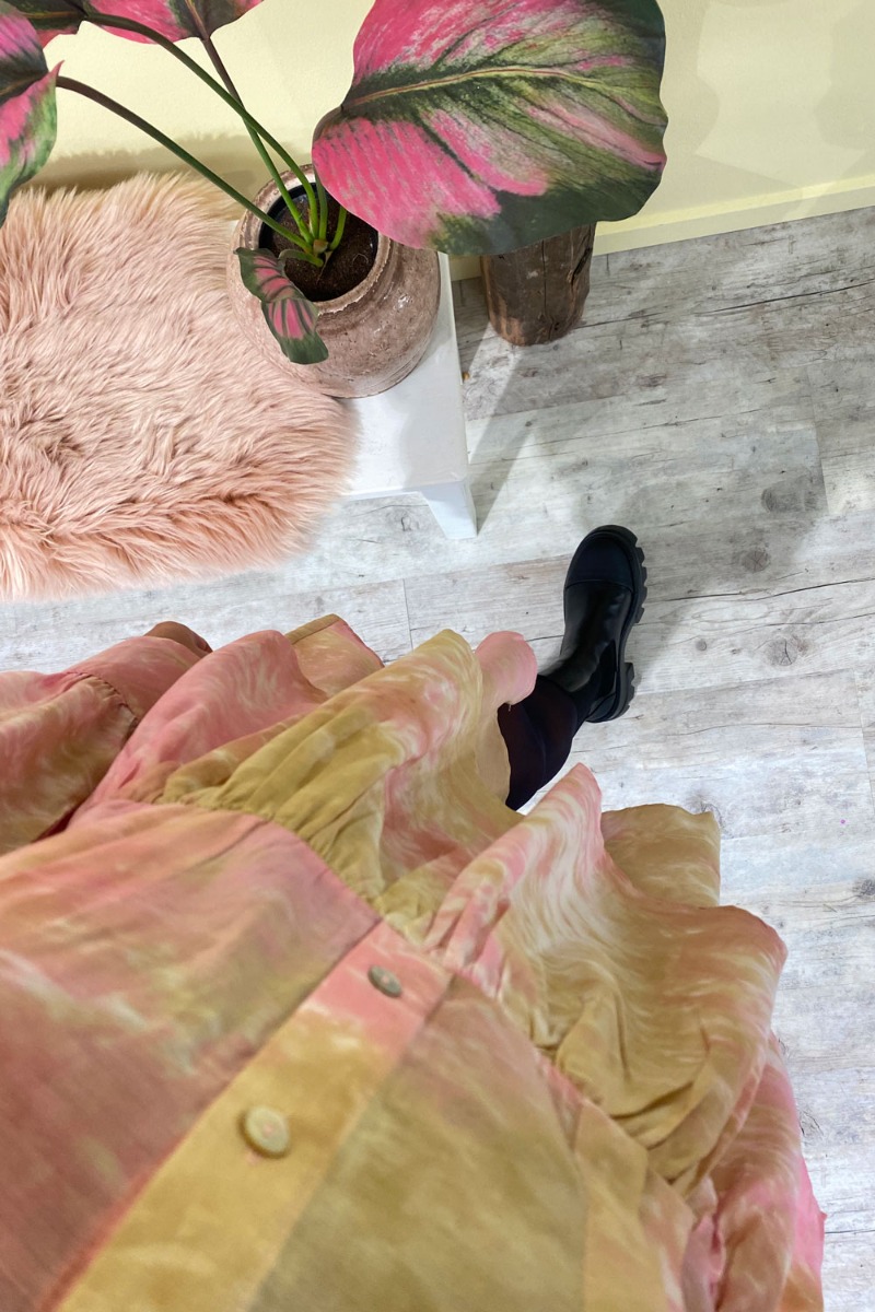 Denne BZR kjole er jo helt fantastisk! Kjolen har det fineste tie dye print som går igen på hele kjolen. Dem har små flæsedetaljer ved kraven og peplum i bunden. De lange ærmer lukkes med knapper ved håndleddet. Style denne kjole med en stilet eller rå støvle.
